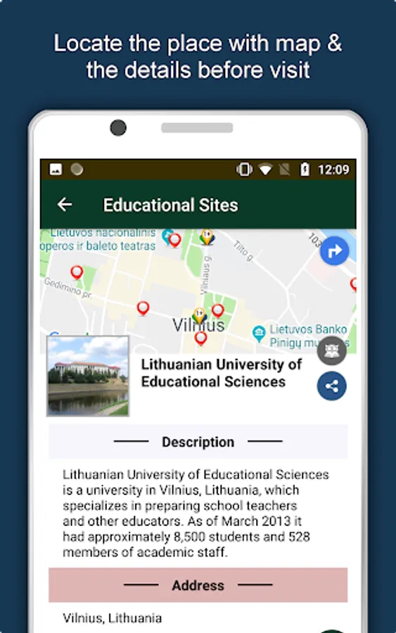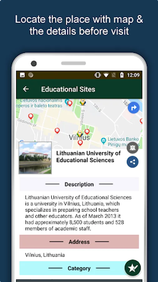 Apart from this, Vilnius Travel & Explore guides you Why, When and How to visit various places in Vilnius with precise location on the detailed Map. There are two ways to explore this app - Category view and EduBank favorite places view. Pin your destinations and get the routes on the Map. Not only this, you can see exactly how the places look like with Street View integrated in this app. The app also has a feature to Rate and write Review/Experience regarding entity(s) through Login. Your Travel experience and rating will help the user community.