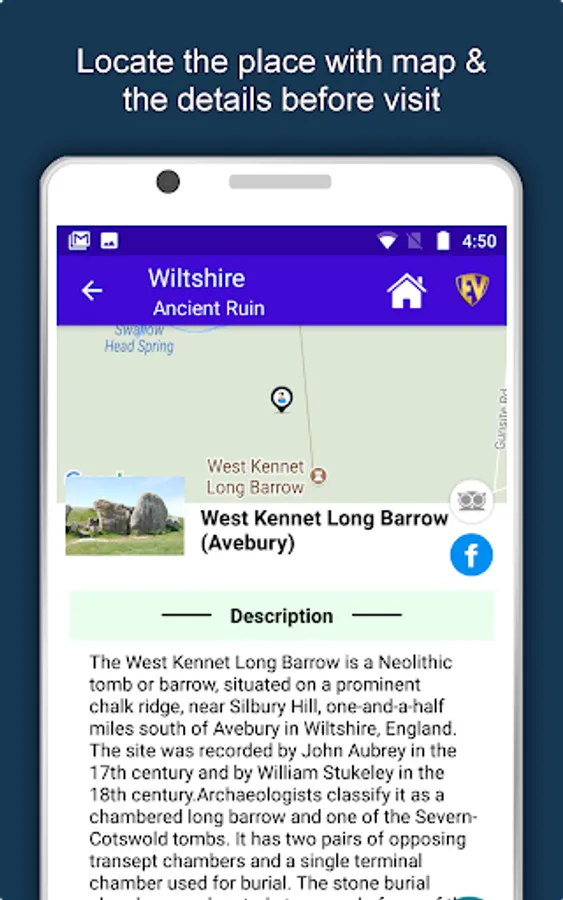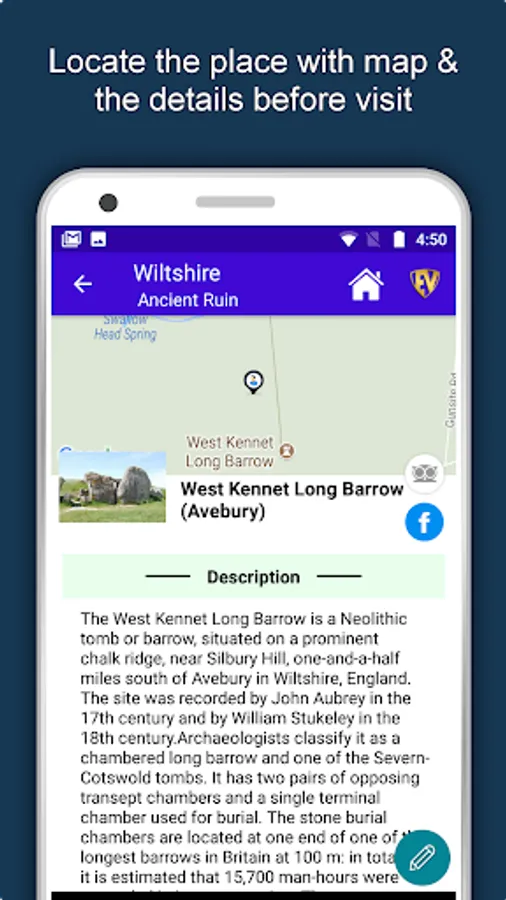 Apart from this, Wiltshire Travel & Explore guides you Why, When and How to visit various places in Wiltshire with precise location on the detailed Map. There are two ways to explore this app - Category view and EduBank favorite places view. Pin your destinations and get the routes on the Map. Not only this, you can see exactly how the places look like with Street View integrated in this app. The app also has a feature to Rate and write Review/Experience regarding entity(s) through Login. Your Travel experience and rating will help the user community.