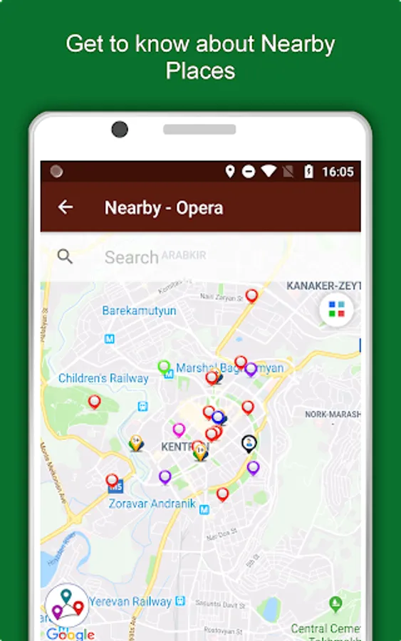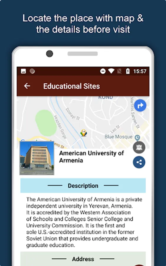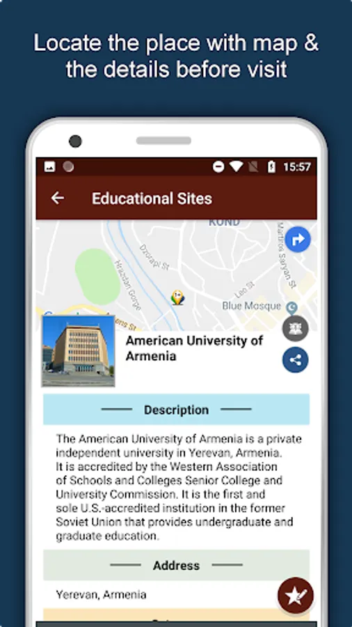 Apart from this, Yerevan Travel & Explore guides you Why, When and How to visit various places in Yerevan with precise location on the detailed Map. There are two ways to explore this app - Category view and EduBank favorite places view. Pin your destinations and get the routes on the Map. Not only this, you can see exactly how the places look like with Street View integrated in this app. The app also has a feature to Rate and write Review/Experience regarding entity(s) through Login. Your Travel experience and rating will help the user community.