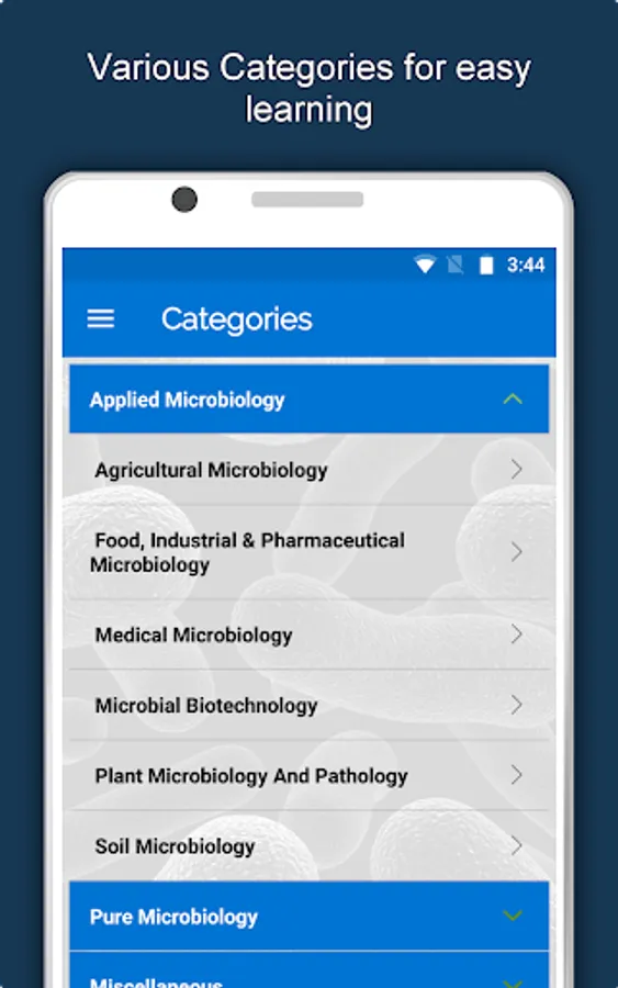 Categories and subcategories in this Offline Microbiology Study App are:-