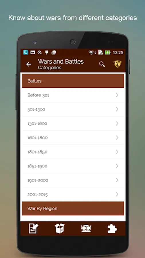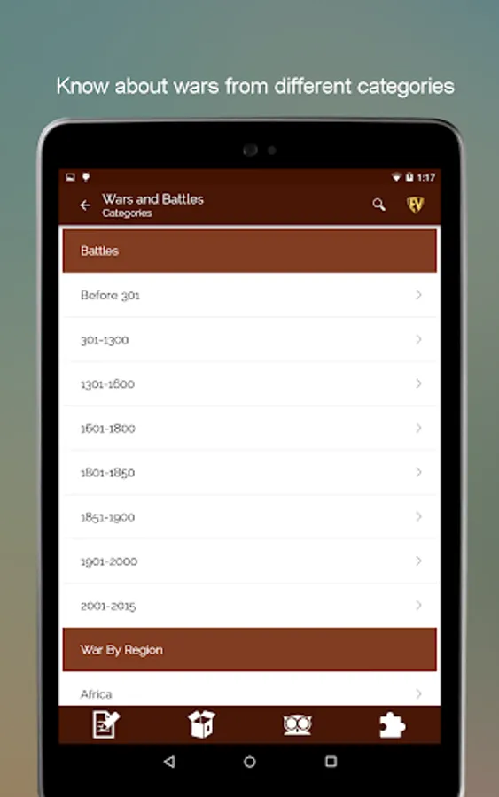 The major wars and battles in Great Wars app are divided into following categories:-