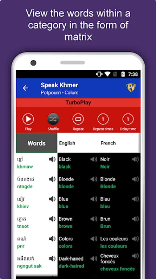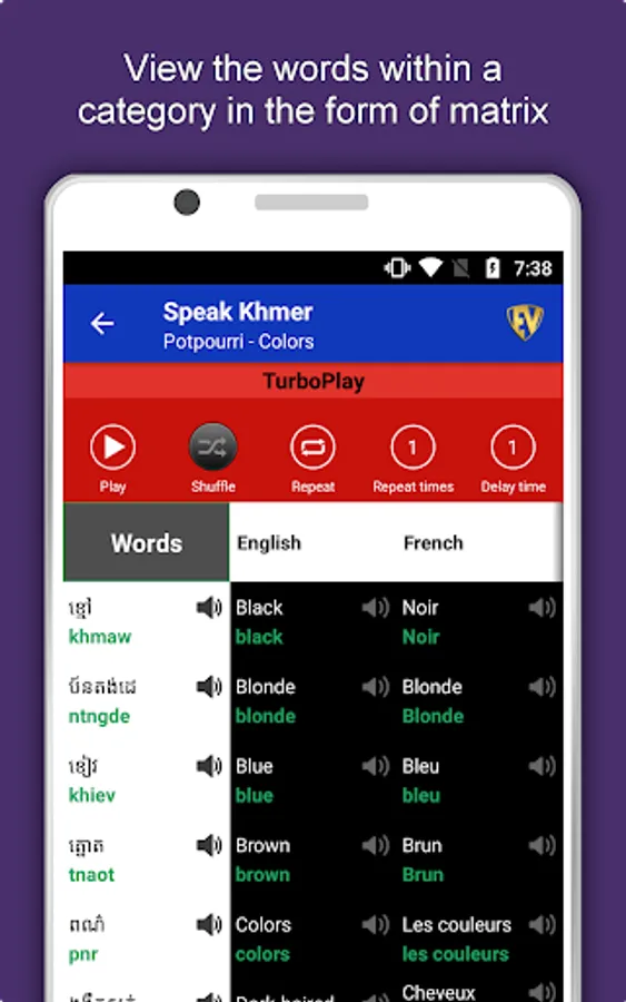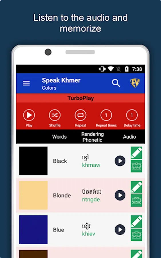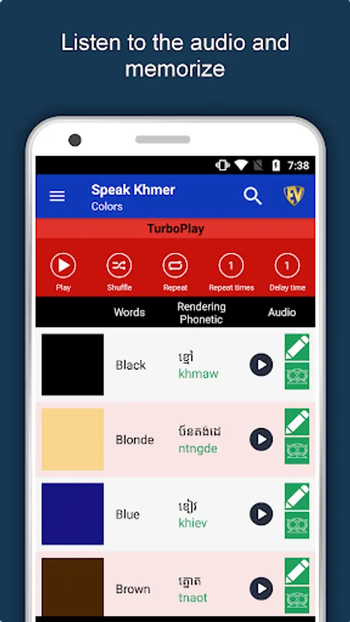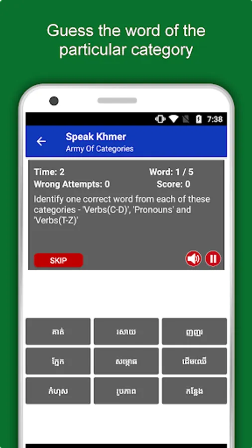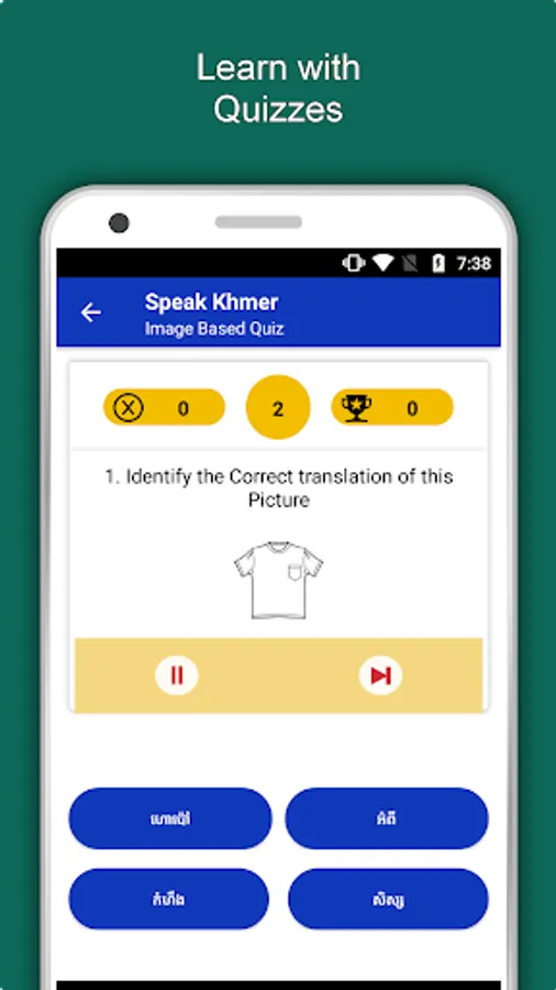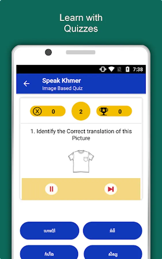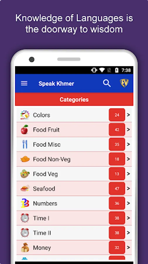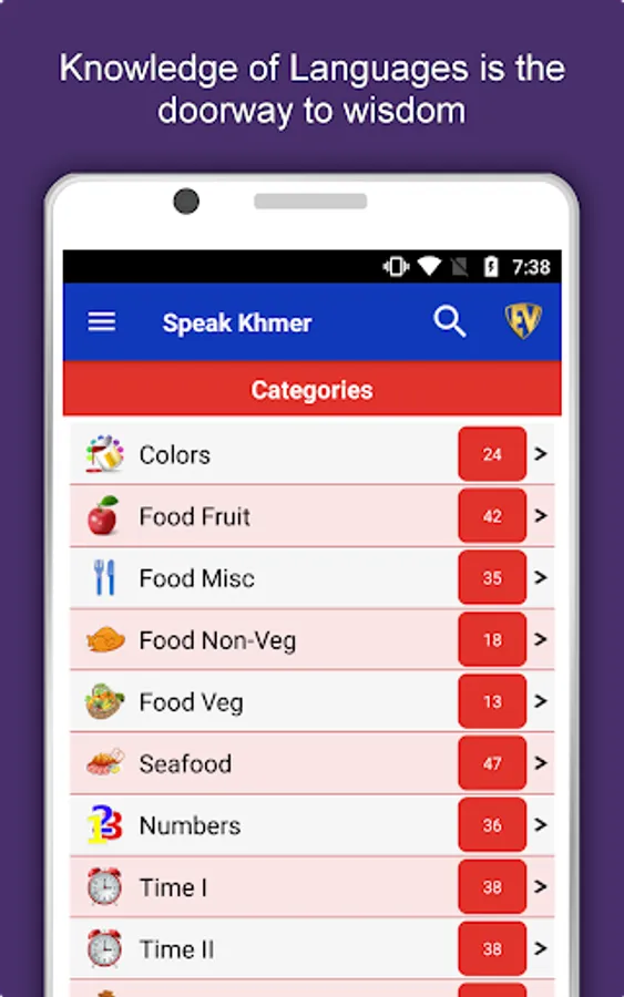 The offline Khmer learning app has 2,135 words with 55 categories. It contains pronunciation, images and phonetics of words for easy learning. Switch base language, Save learnings in EduBank℠, audio play, Potpourri and retention games are the main features of Speak Khmer app.
