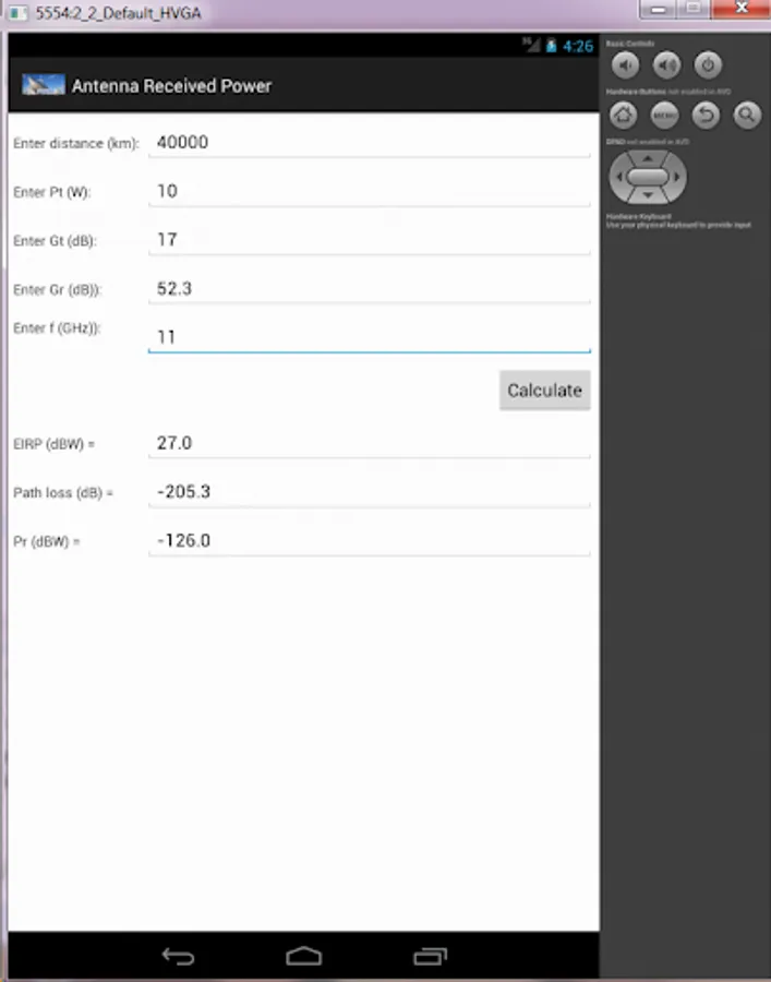 Knowing the gain (Gr in dB) of the receiving antenna, the distance from the satellite to the receiving antenna on earth (Km), the frequency that the satellite operates at (GHz), the radiated power of the satellite (in Watts) and the gain of the satellite antenna (dB) this app will return the EIRP (dBW), path loss (dB) and the received power of the earth station antenna.