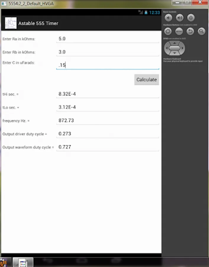Adding a second resistor Rb to the 555 timer and connecting the trigger input to the threshold input causes the timer to self-trigger and run as a multivibrator. The capacitor C will charge through Ra & Rb and discharge through Rb only. The duty cycle can be controlled by changing the values of Ra and Rb. Input Ra, Rb (in kOhms) & C (in uFarads) then push the Calculate button to get the values for the output high-level duration tH and low-level duration tL and frequency. Output driver and output waveform duty cycles are also determined.