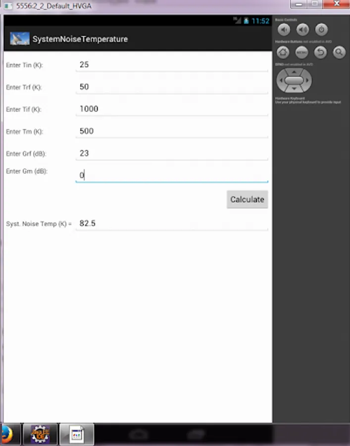 This is the noise model of a receiving antenna, where all of the noisy units have been replaced by one noiseless amplifier with a single noise source Ts as its input. Calculate the system noise temperature Ts after entering Tin (noise temperature of the antenna), Trf (noise temp. of RF amplifier), Tif (noise temp. of IF amp), Tm (noise temp. of mixer...all in deg. K), then Grf & Gm (gains of RF amp and mixer, both in dB). As the first example, use Tin = 25, Trf = 50, Tif = 1000, Tm = 500, Grf = 23 & Gm = 0. Press the "Calculate" button and your result should be 82.5 K.