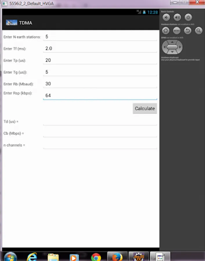 This app is used to determine the number of voice channels that each earth station TDMA can transmit as well as the transmission rate if the earth stations send data rather than digital speech. The data burst duration (Td) for each earth station is determined after entering the the number of earth stations N, the frame duration Td (in ms), the preamble time Tp (in us), guard band Tg (us), the the baud rate of the transmission bursts in Mbaud which are QPSK (which carry 2 bits) and the value for Rsp, which is the kbps value of the voice channels. The other outputs are the capacity of each earth station in Mbits/sec, Cb and the number of digital speech channels that can be carried by one earth station, n.