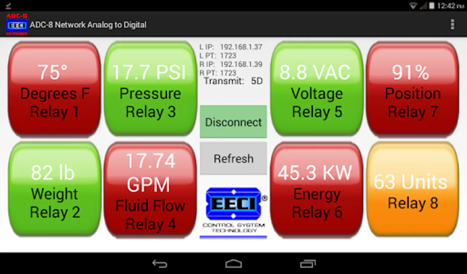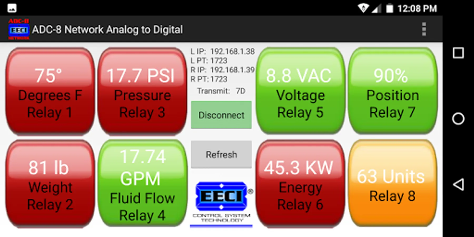 The ADC-8 Network A to D Relay Controller App is the ideal solution for hundreds of applications where remote monitoring of analog levels and control of external devices is needed. Connect any of EECI's Analog to Digital converters to your Windows PC or Laptop and monitor the analog output levels from any sensor or device with an analog output. Relays may be used to control HVAC equipment, motors, flow rates, demand usage, appliances, indicator panels, heaters, robotics, alarms and thousands of other electrical devices.