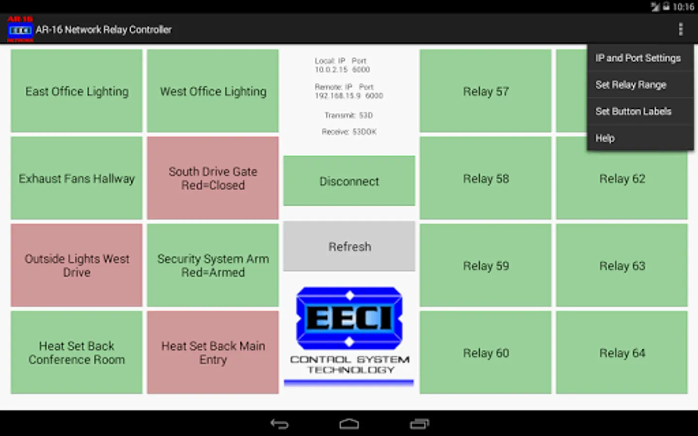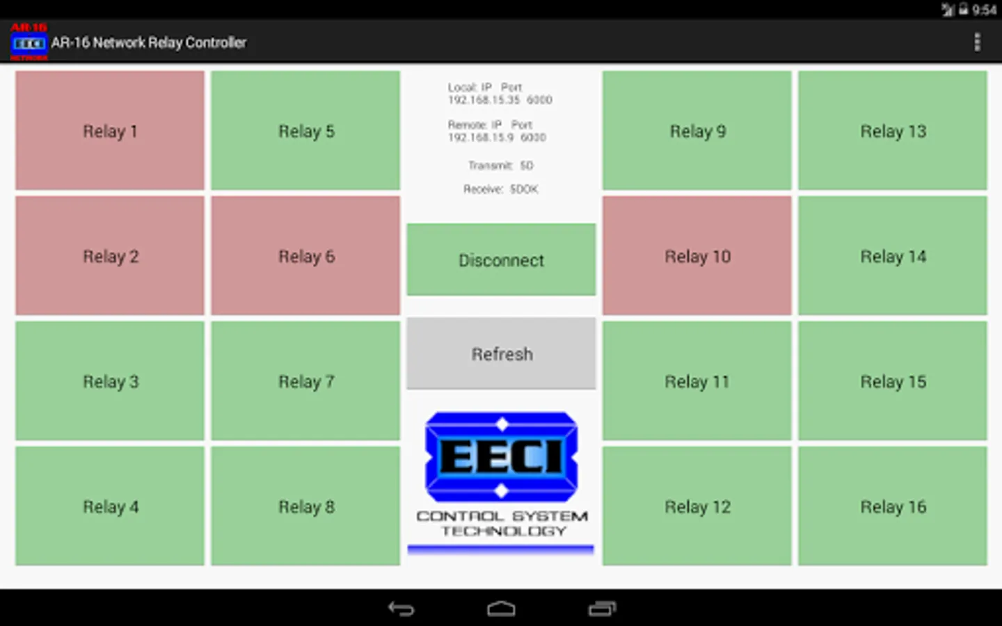 This App allows you to remotely energize or de-energize a relay from your tablet or phone's touch screen using your local network, mobile network, Wi-Fi or from anywhere in the world via Internet. The App's start-up screen allows you to control all 16 of the AR-16 relays. Touch the relay button for the desired relay and the relay will energize (button will turn red when remote server acknowledges). Touch the button again and the relay will de-energize (button will turn green when remote server acknowledges). Label the relay buttons as needed from within the App or just create a text file using Notepad on your desktop PC and then copy to the EECI folder on your tablet or phone. App storage is turned off by default but may be turned on under App Permissions. Storage may be left off and is only needed to save the app settings.