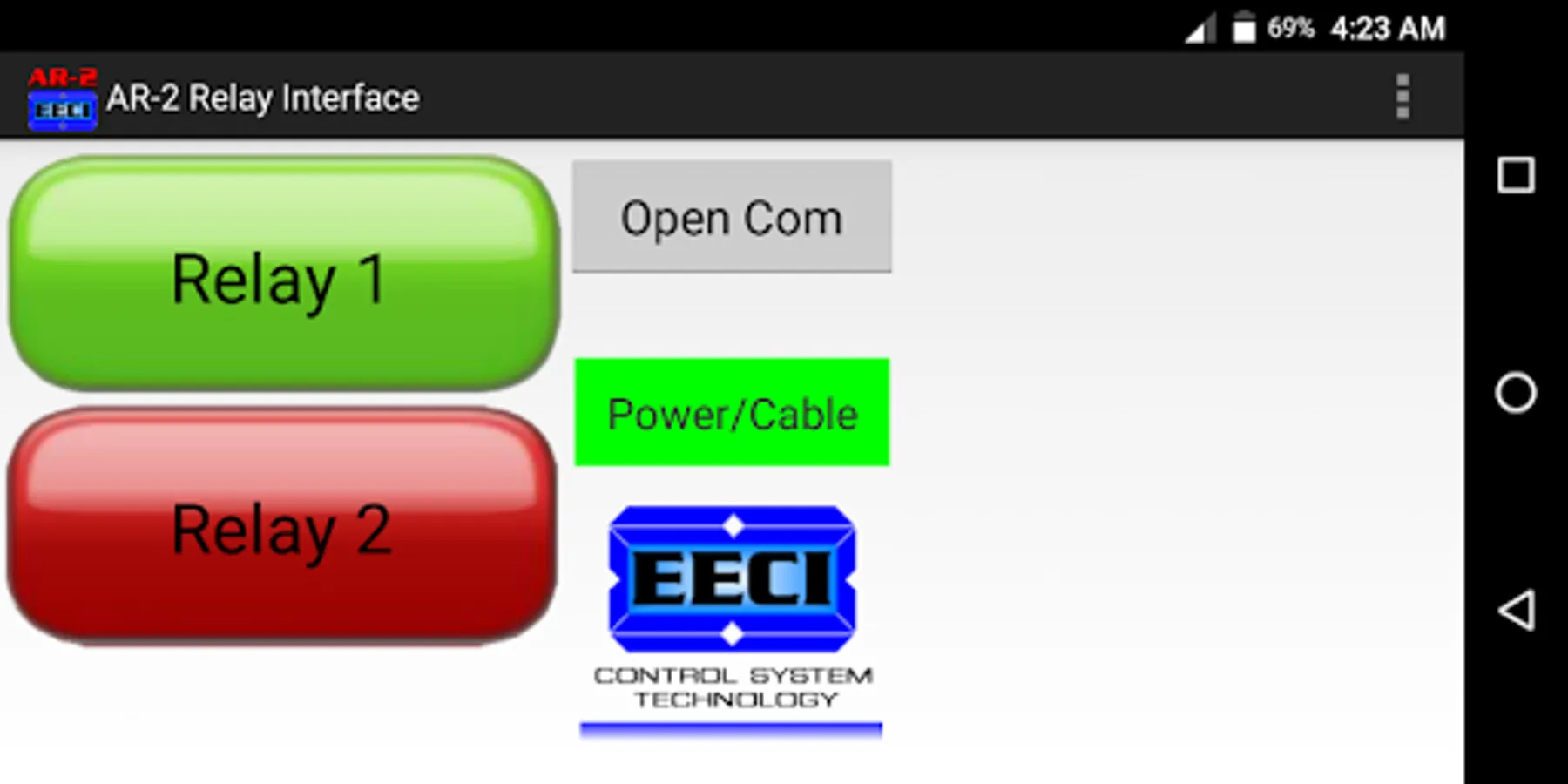 This App allows you to instantly energize or de-energize a relay from your tablet or phone's touch screen. The app's start-up screen allows you to control the two AR-2 relays. Touch the relay button for the desired relay and the relay will energize (button will turn red). Touch the button again and the relay will de-energize (button will turn green). Label the relay buttons and input boxes as needed from within the App or just create a text file using Notepad on your desktop PC and then copy to the EECI folder on your tablet or phone. App storage is turned off by default but may be turned on under App Permissions. Storage may be left off and is only needed to save the app settings.