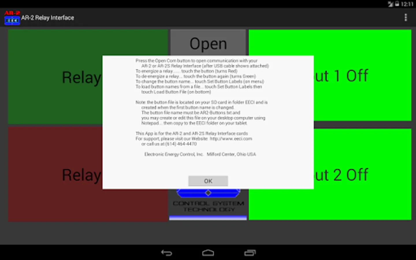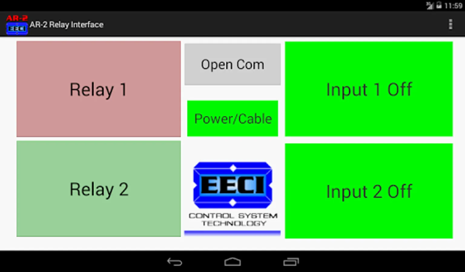 The AR-2 Relay Controller App has been developed to run on Android operating systems Android 3.2 up to 11 which includes Honeycomb, Ice Cream Sandwich, Jelly Bean, KitKat, Lollipop, Marshmallow, Nougat, Oreo, Pie, Q and Red Velvet Cake. Root permission or special driver not needed for most Android phones and tablets that use the Android operating system 3.2 or higher (Honeycomb and up), just enable USB Host Mode*. Free telephone support is provided for this app by contacting EECI® Support at (937) 349-6000.