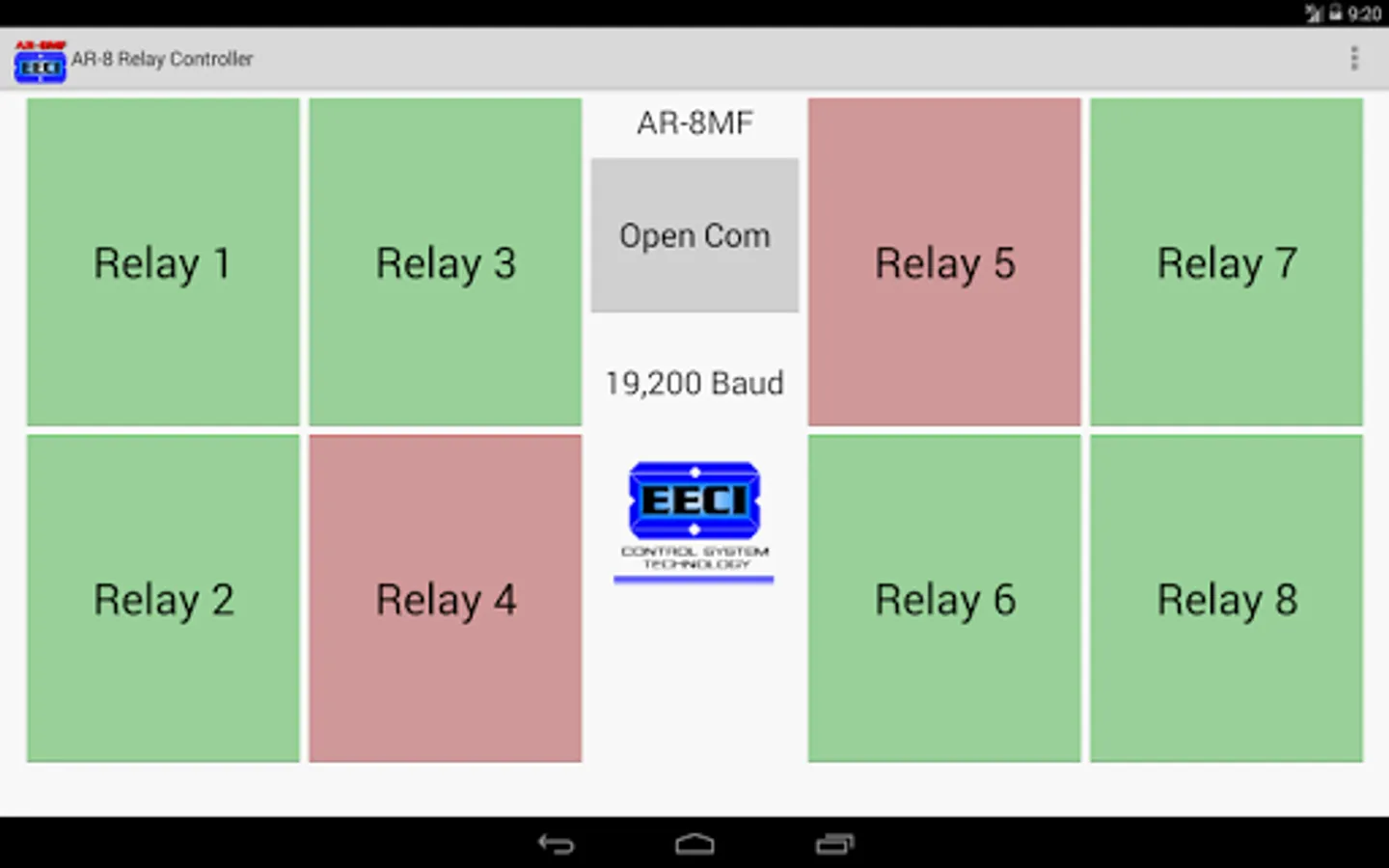 This App allows you to instantly energize or de-energize a relay from your tablet or phone's touch screen. The app's start-up screen allows you to control the eight AR-8 relays. Touch the relay button for the desired relay and the relay will energize (button will turn red). Touch the button again and the relay will de-energize (button will turn green). Label the relay buttons as needed from within the App or just create a text file using Notepad on your desktop PC and then copy to the EECI folder on your tablet or phone. App storage is turned off by default but may be turned on under App Permissions. Storage may be left off and is only needed to save the app settings.