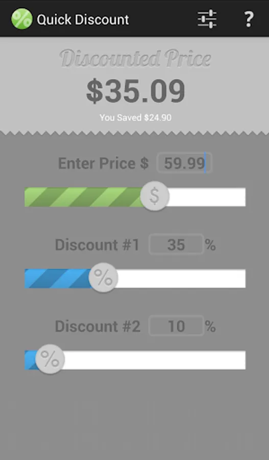 When you're out shopping you don't have time to type or press a ton of small buttons. This app instantly calculates your discounted price without any typing or tedious button pressing. Just use the sliders to adjust the price, discount, and even a second discount. The discounted price updates instantly and you can get back to your shopping. It even displays the amount you saved right below your discounted price. Quick and easy shopping!