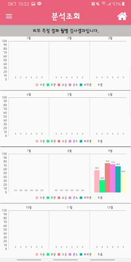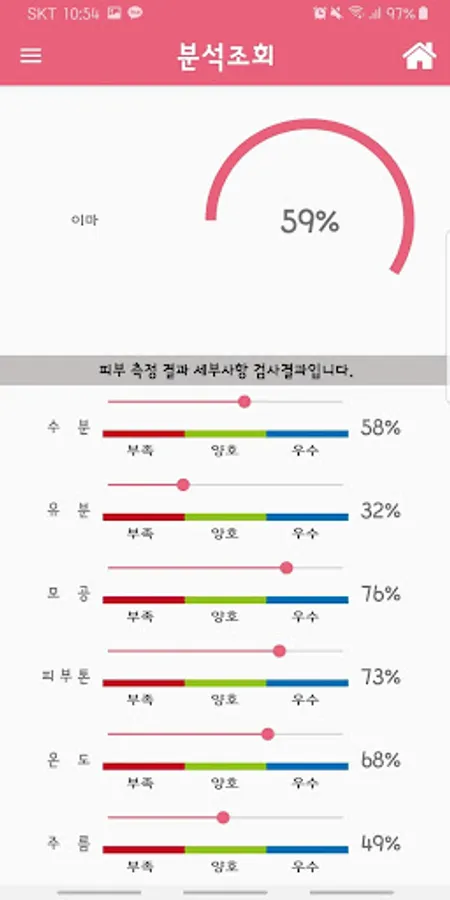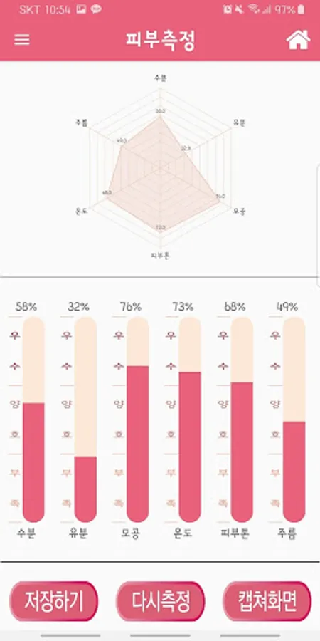 Measures and shows oil, moisture, temperature, skin tone, pores and wrinkles from the device.
