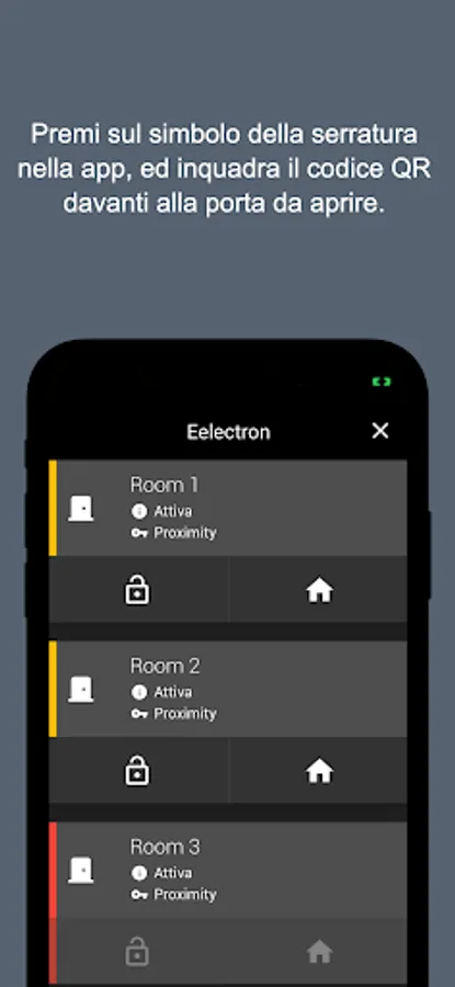 Once in front of the door of your room, or to open any external doors to the structure or to access common services, press the lock symbol in the app, and place the QR code in front of the door to be opened.
