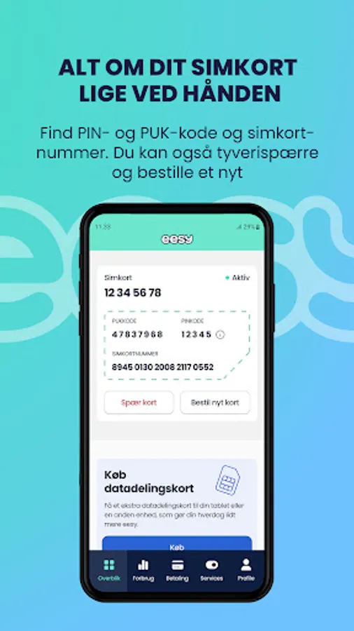 - Get a full overview of your consumption - both in real time and your average consumption per month (See your usage of voice, data and EU data).