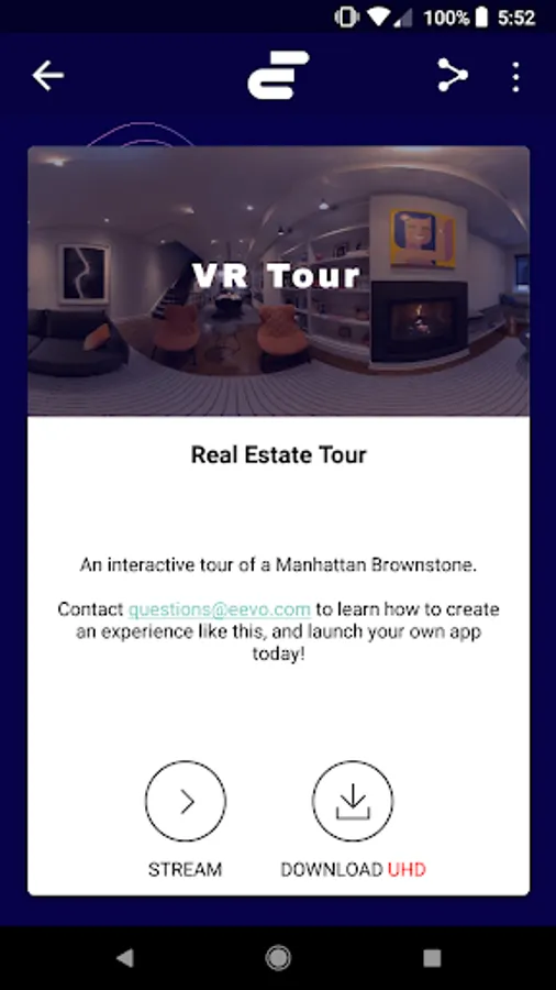 eevo is a publishing platform that makes the creation, distribution and management of interactive VR video possible for anyone. Linking this application to your EEVO account allows you to instantly download or stream VR content that you have uploaded to your online portfolio. The EEVO app also makes it easy to share your VR content with partners or clients.