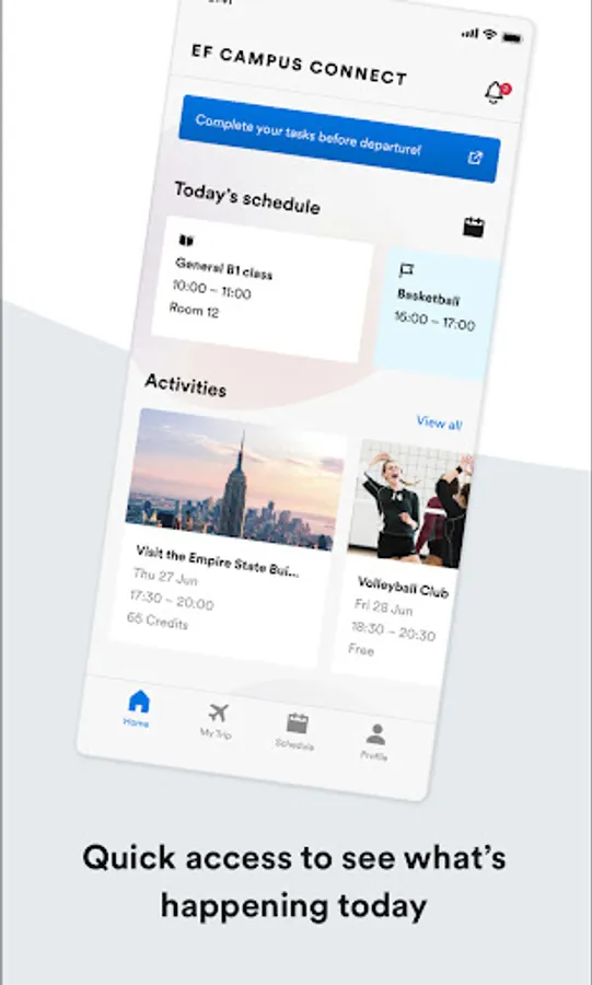 Here’s where you find all about your trip with EF. From getting your travel documents verified to schedule overview, we’ve it all under EF Campus Connect.