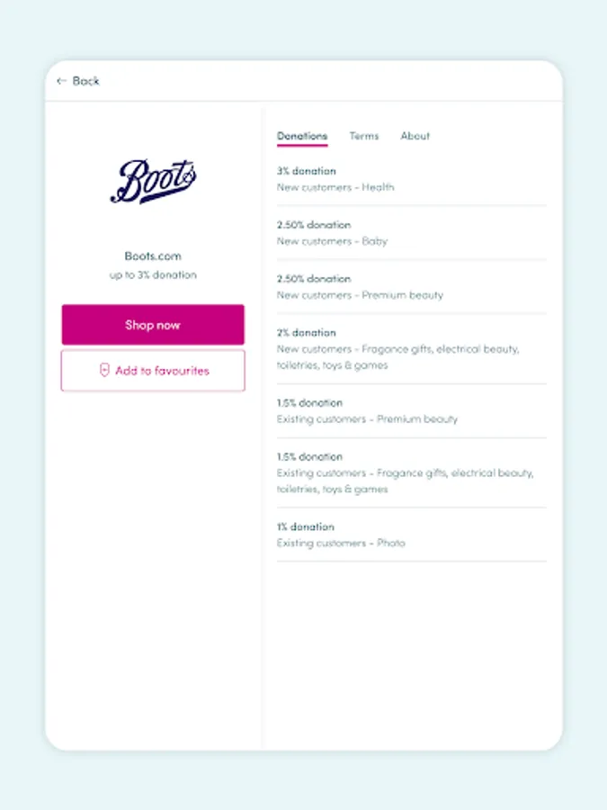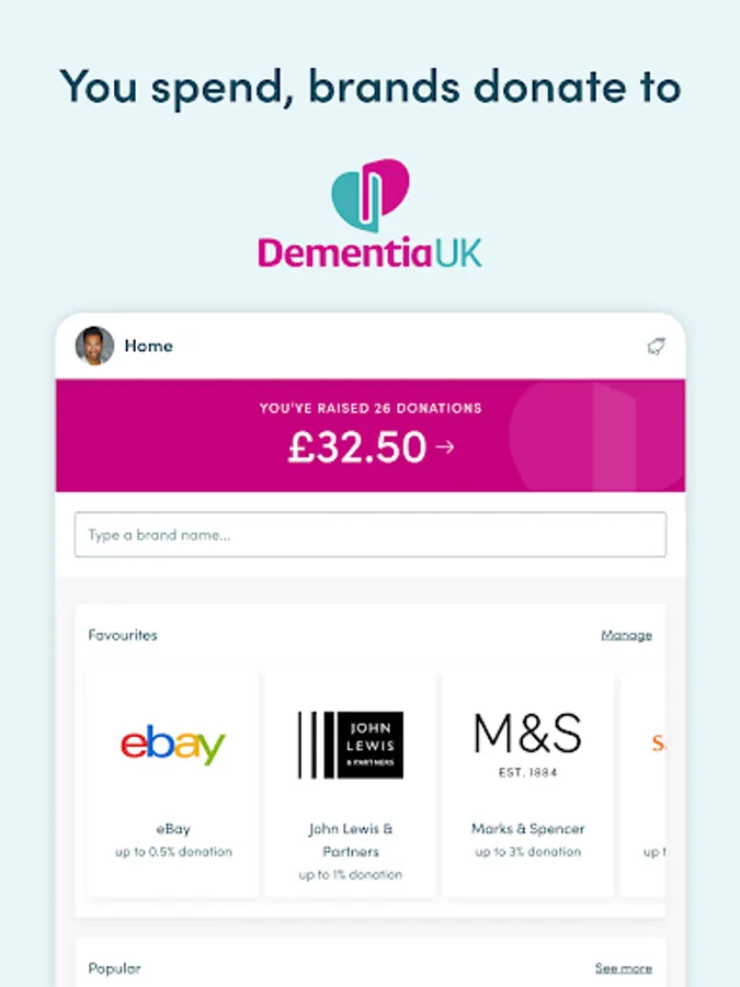 Over 7,000 well-known brands will donate a percentage of what you spend with them to Dementia UK. Your shop won't cost you any extra! The cost is covered by the brand.