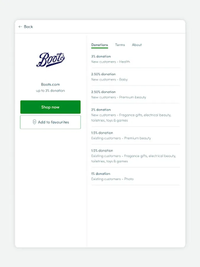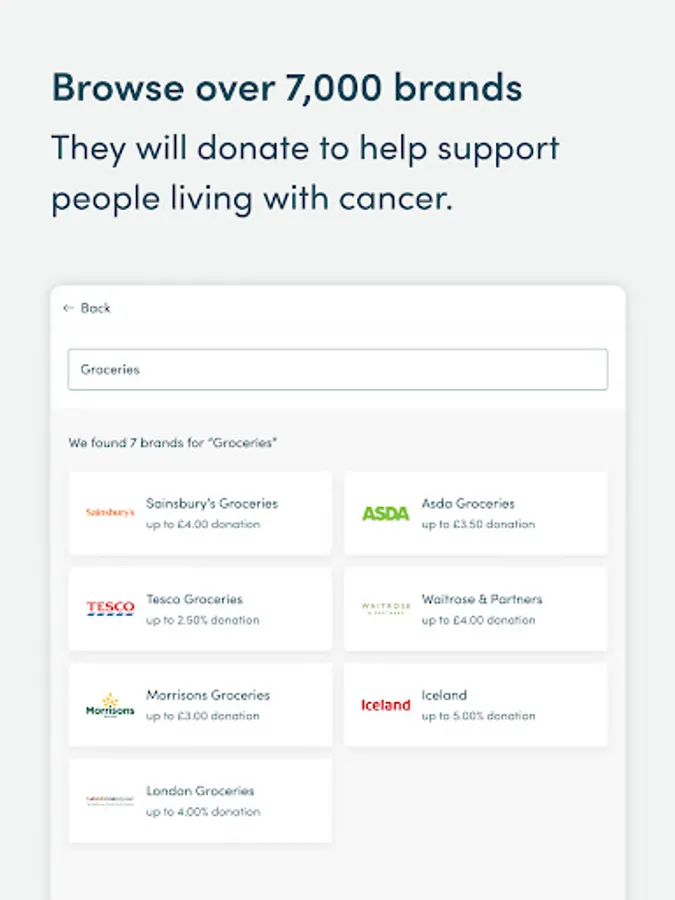 Over 7,000 well-known brands will donate a percentage of what you spend with them to Macmillan Cancer Support. Your shop won't cost you any extra! The cost is covered by the brand.