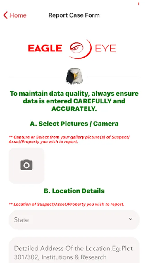 (2).Location Details of incidence(Select State and address Of incidence).(3)Description (Detailed explanation of what you want to report).Informant Details is Optional.