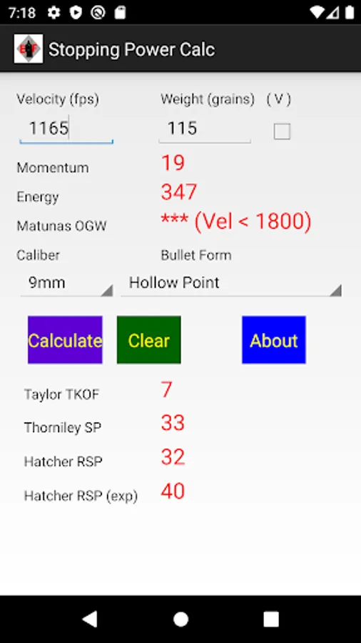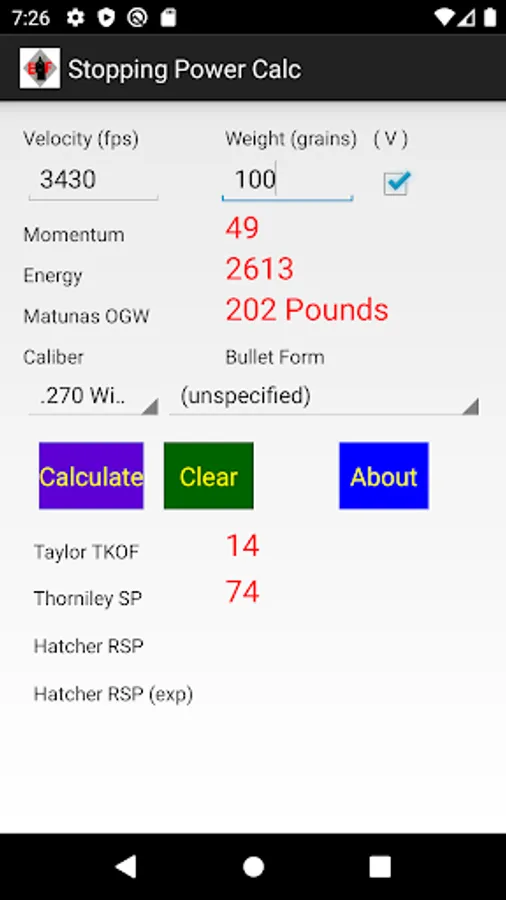 If you also enter bullet form, the Hatcher Relative Stopping Power value is also available (with the expanded value for hollow/soft point).