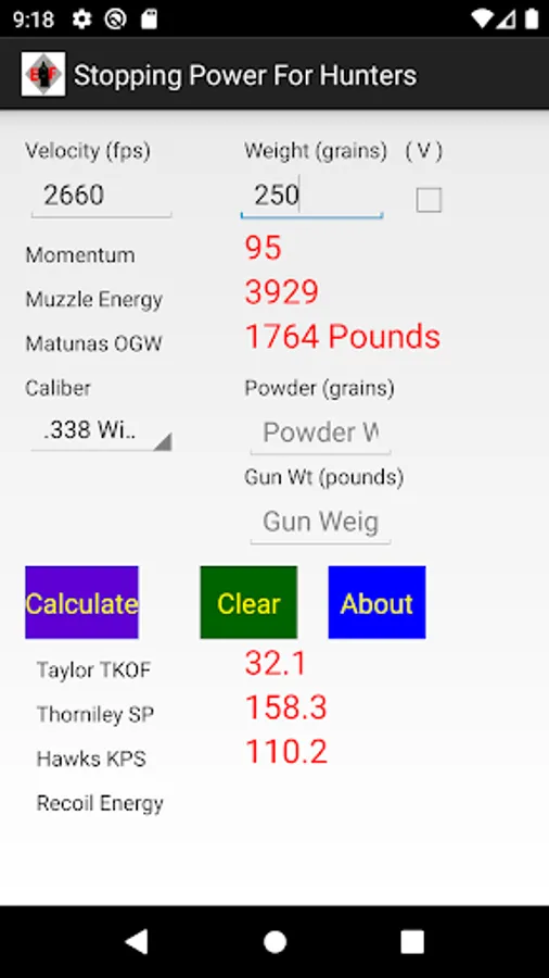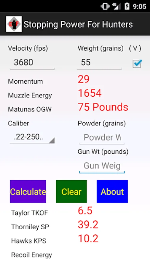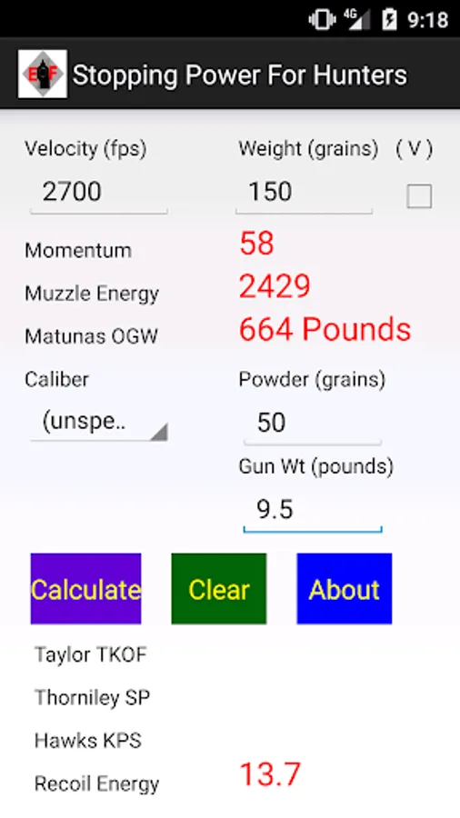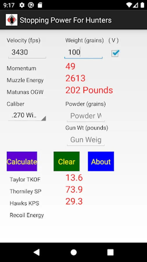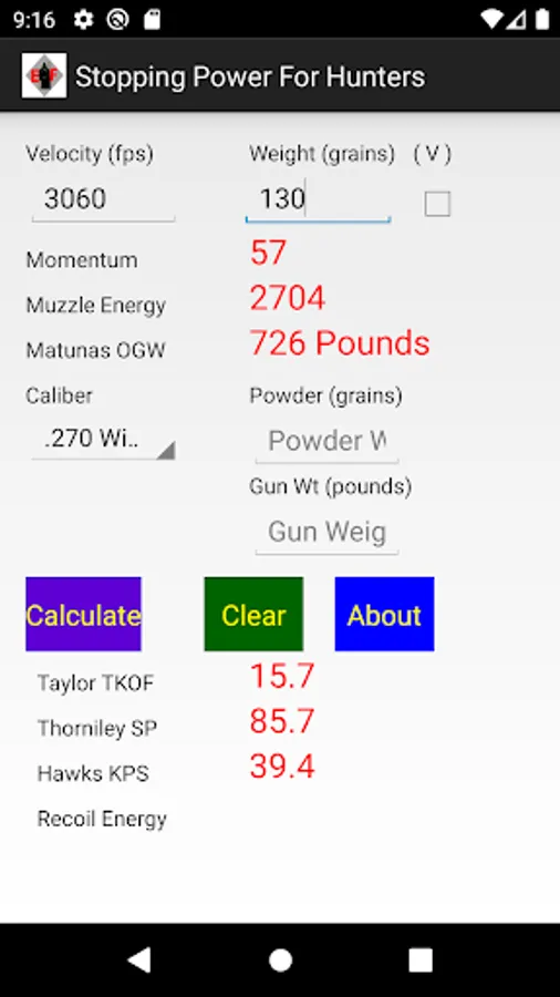 Enter the caliber and you can also display the Taylor Knock Out Factor (TKOF), the Thorniley Stopping Power (SP), and the Hawks Killing Power Score (KPS).