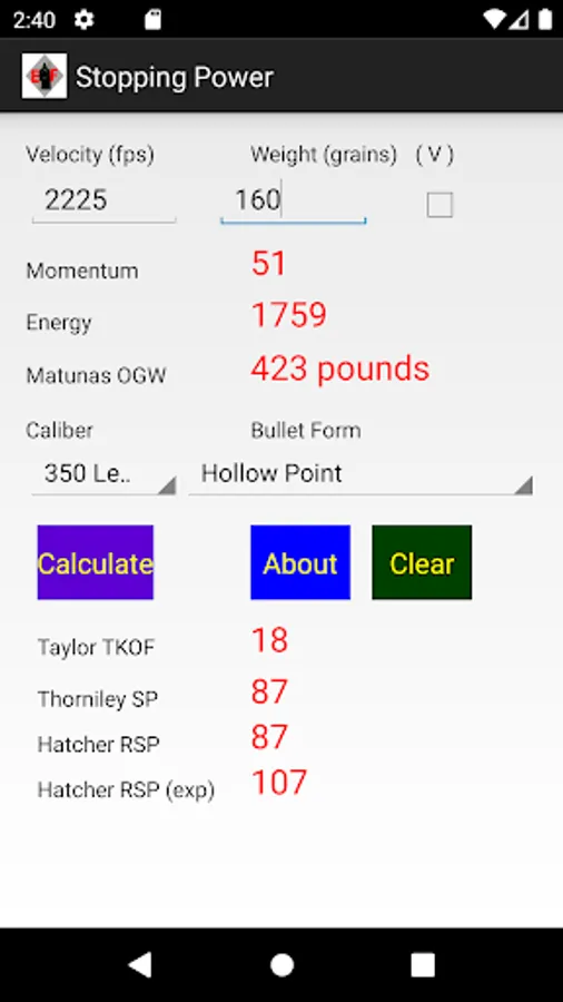 If you also enter bullet form, the Hatcher Relative Stopping Power value is also available (with the expanded value for hollow/soft point).