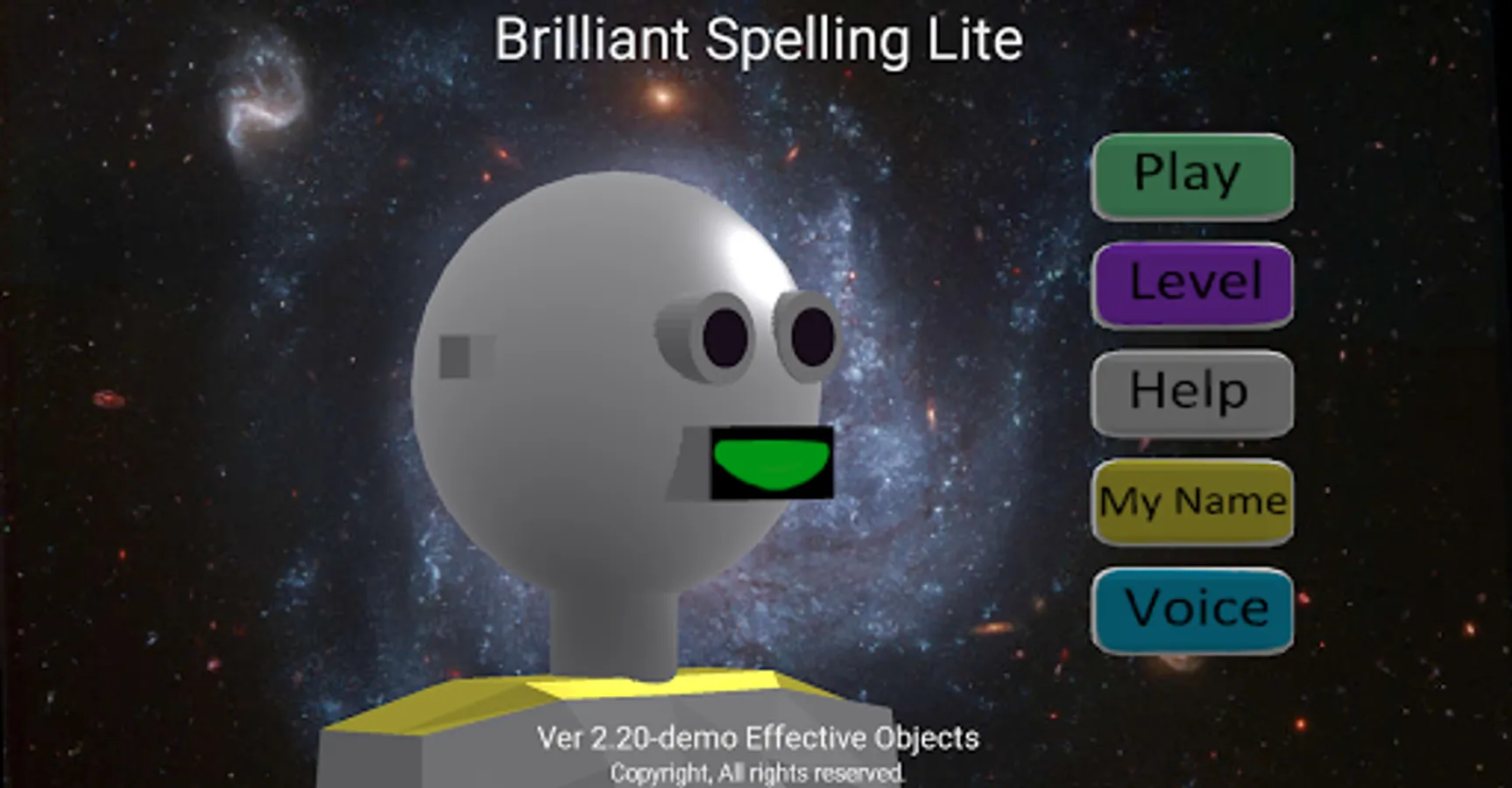 Brilliant Spelling is a fun and entertaining game with a friendly speaking robot to guide you. Advance through the levels as you increase your knowledge. Over 3100 American English words are included in the full version (about 500 words in this LITE version). You may also enter your own word lists and play the game to learn them. Great for adults and kids who want to learn to spell but wish to have fun doing it!