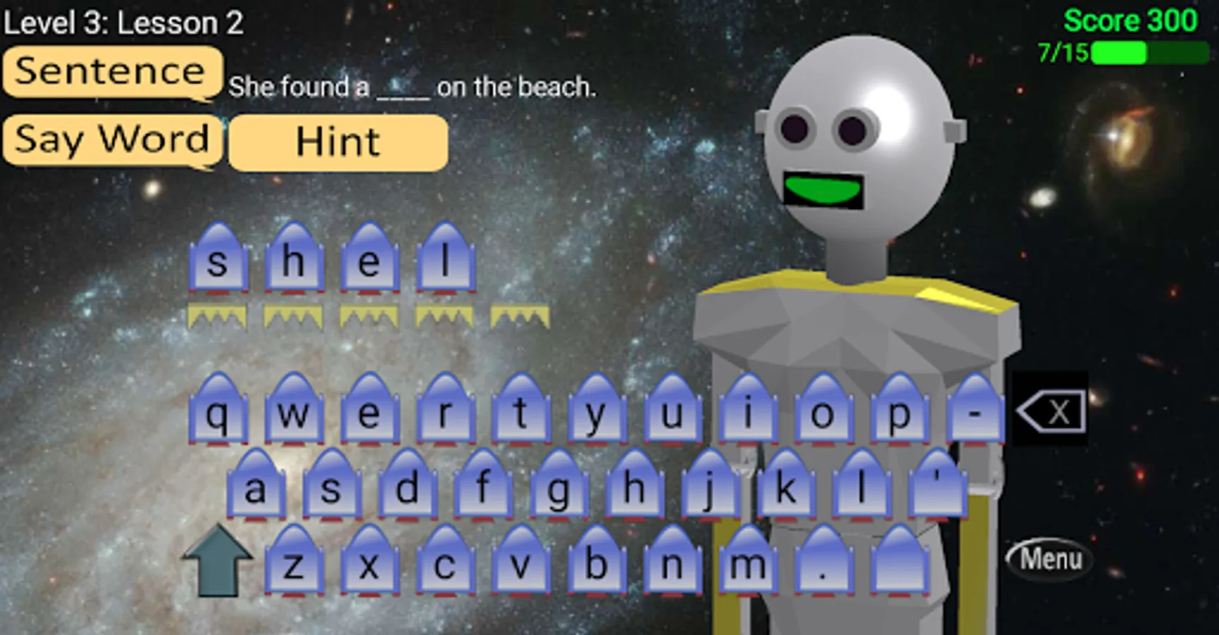 Brilliant Spelling works like this: Start by entering your name. From then on, the tutor refers to you by name. The Brilliant Spelling tutor uses text-to-speech to talk to the user. What happens next is almost magical. The robotic tutor named WordBot makes friends with you as it steps through the spelling levels. It is a two way interaction with you entering words and tapping the buttons, and the tutor talking and drawing you in. You have to try it to believe it.