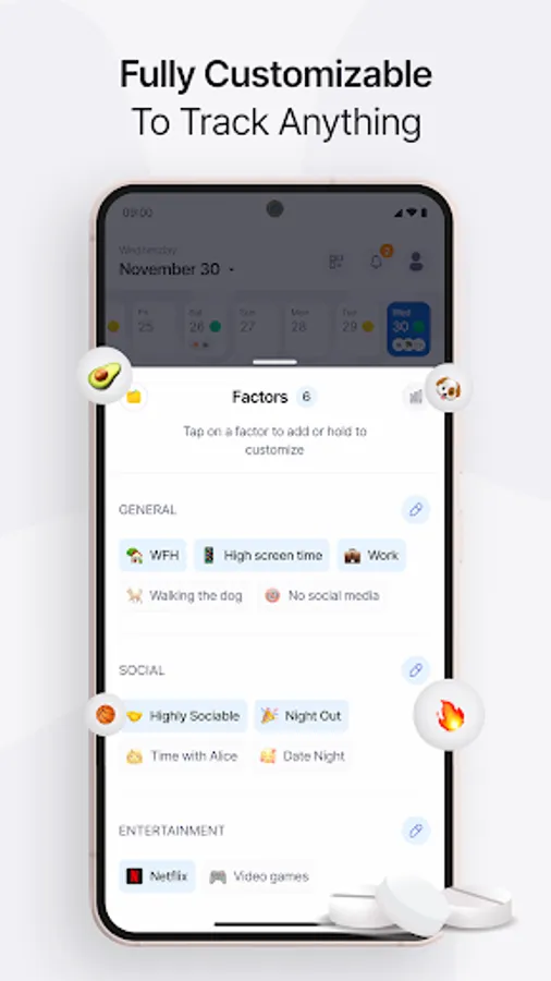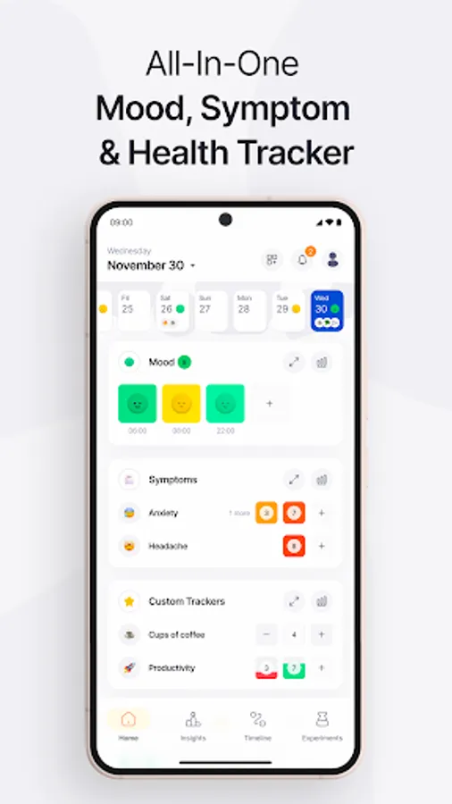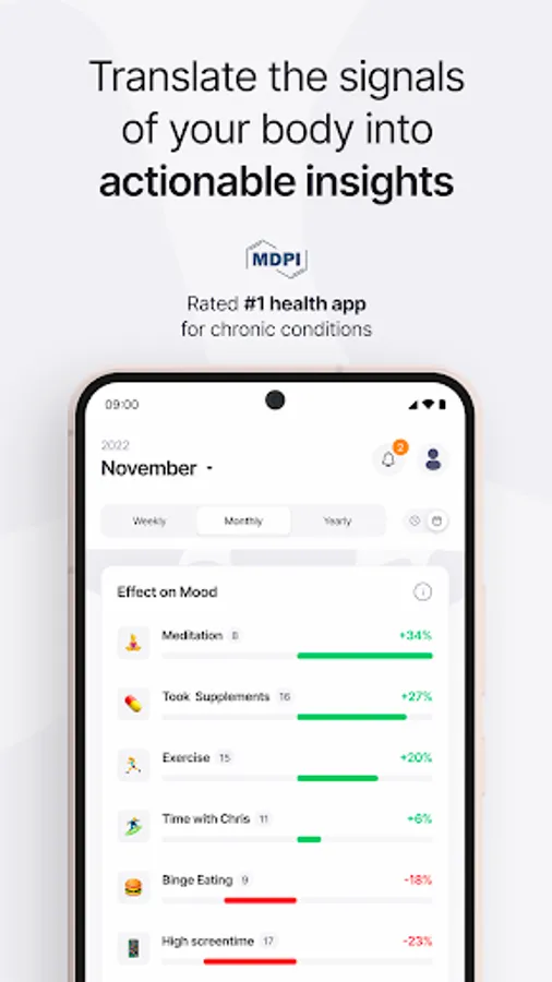 It only takes a few minutes a day. First, add your mood (1-10), symptoms (1-10), emotions, and any additional factors you want to track. Activities, hobbies, foods, sleep, blood pressure, photos, and moodnotes are all possible options – but there's no limit to how you use the app.