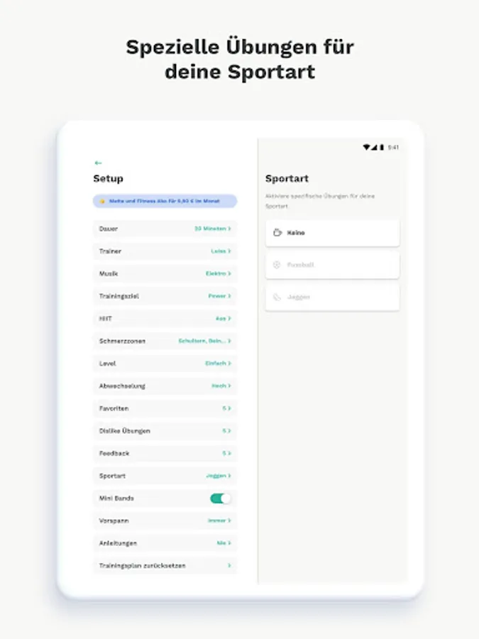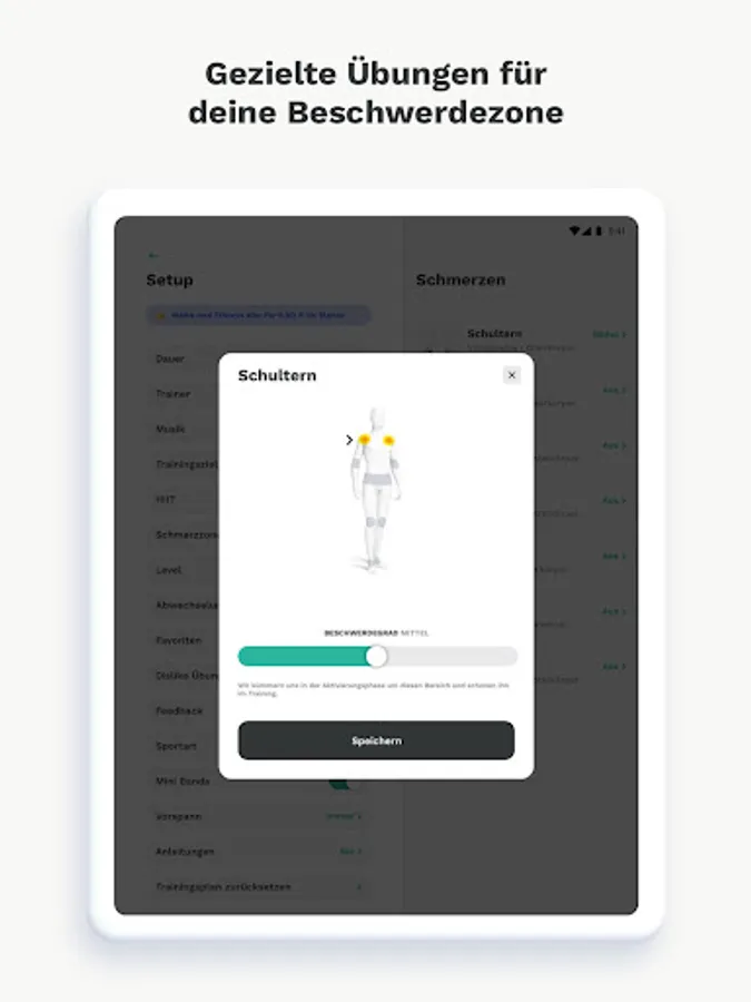 Choose 3 of 6 preset goals, each workout is aimed at your selection. With various settings, your personal training can be adjusted even more individually to you: 7 complaint zones, length of training units, with/without instructions, simple/complex movement sequences and much more.