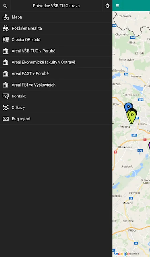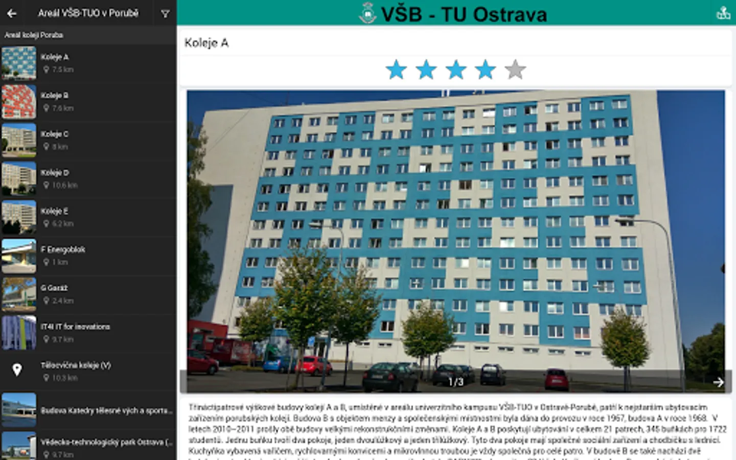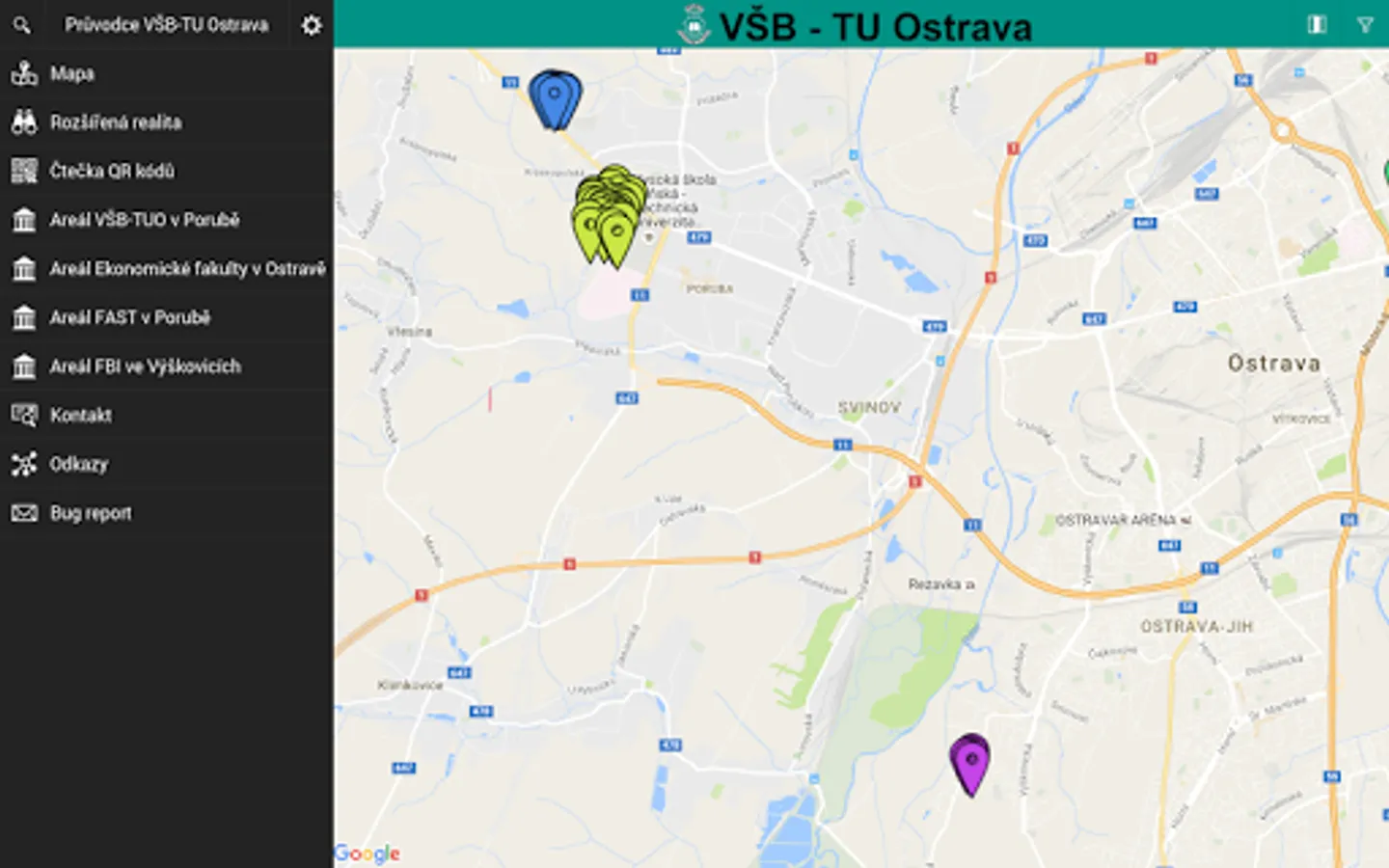 Mobile Guide of VŠB - Technical University of Ostrava serves to provide guidance in the campus of VŠB - Technical University of Ostrava. In the form of map provides basic information about the layout of buildings within the university and allows navigation to the selected object.
