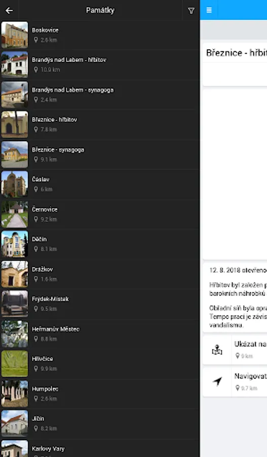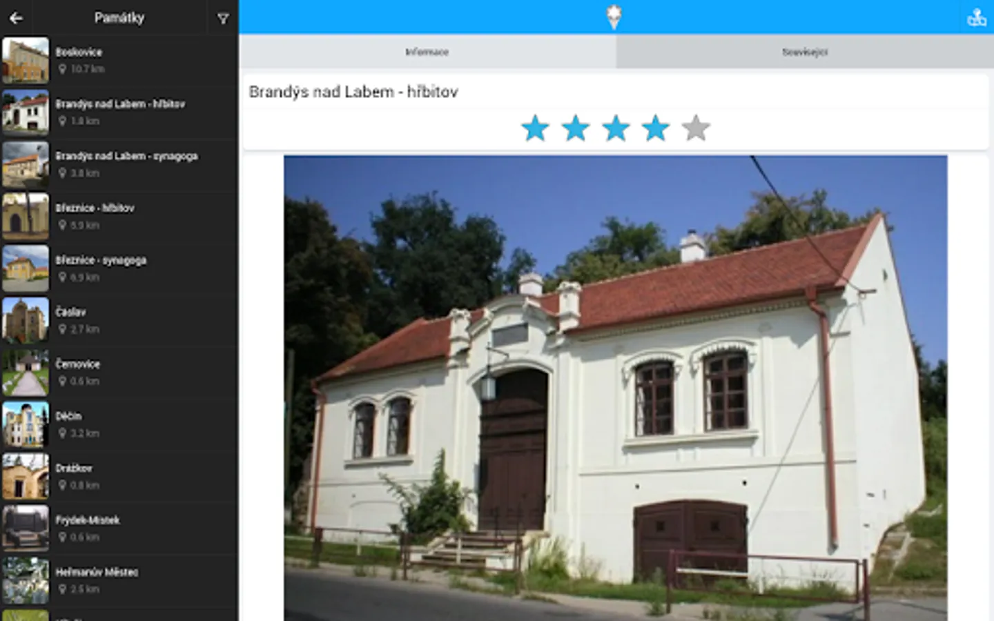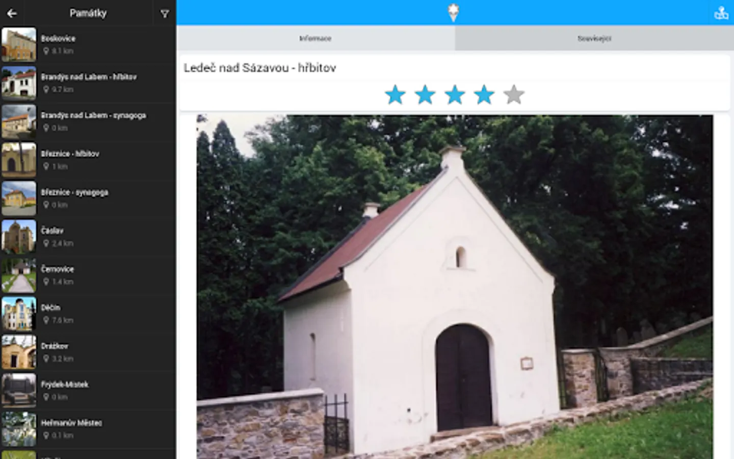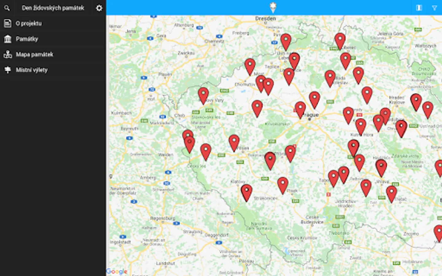 The Jewish Community in Prague, together with the Matana a.s. Building and Cemeteries Administration, the Federation of Jewish Communities in the Czech Republic and other partners, regularly, on the second Sunday of August, make available selected monuments throughout the Czech Republic as part of the Jewish Monument Day. This app currently and clearly represents all the objects involved, including additional information (navigating to monuments, routes between objects within a single location, etc.).