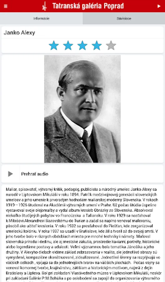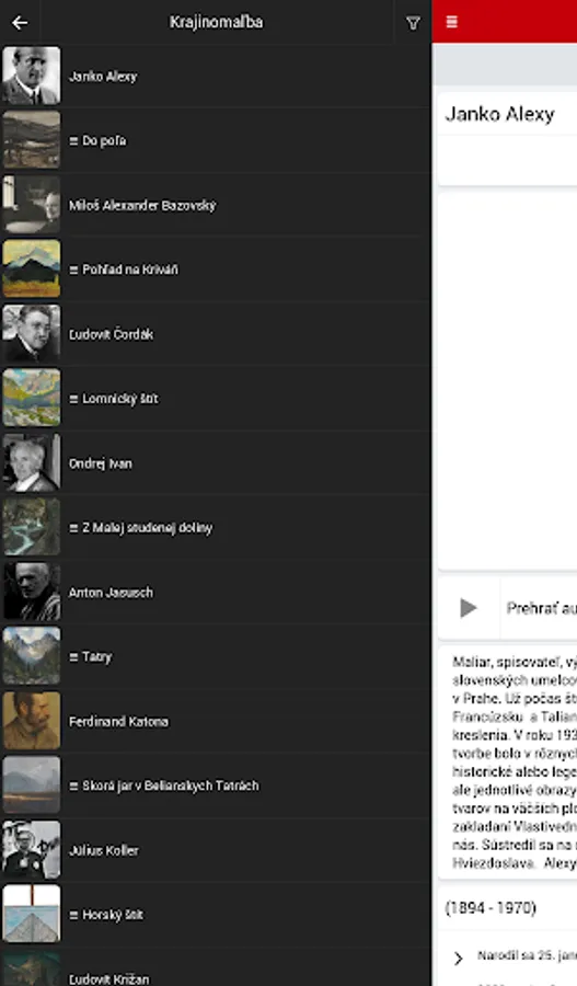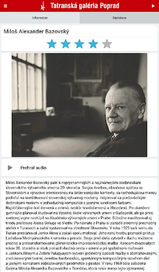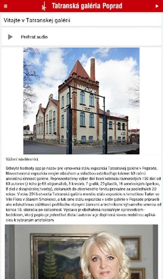Guide to Permanent Exhibition of the Tatra Gallery in Poprad - APP Expanded Values will accompany you with audio commentary, which is activated by QR codes that are placed in the gallery for each picture. In addition to texts, authors and their works are also available. Photos can be enlarged.