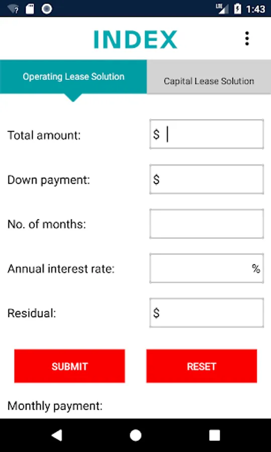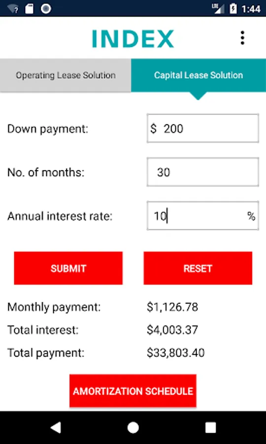 The Equipment Lease Calculator offers a quick and easy way to solve lease payments for either an Operating Lease / Rental or a Capital Lease / Loan structure with a term ranging from 1-360 months. Once calculated, simply view or email the amortization schedule to yourself or EFG for a Loan. You may also call EFG for advice.