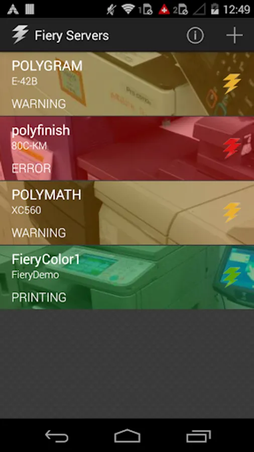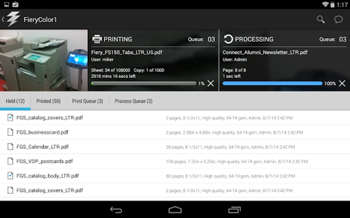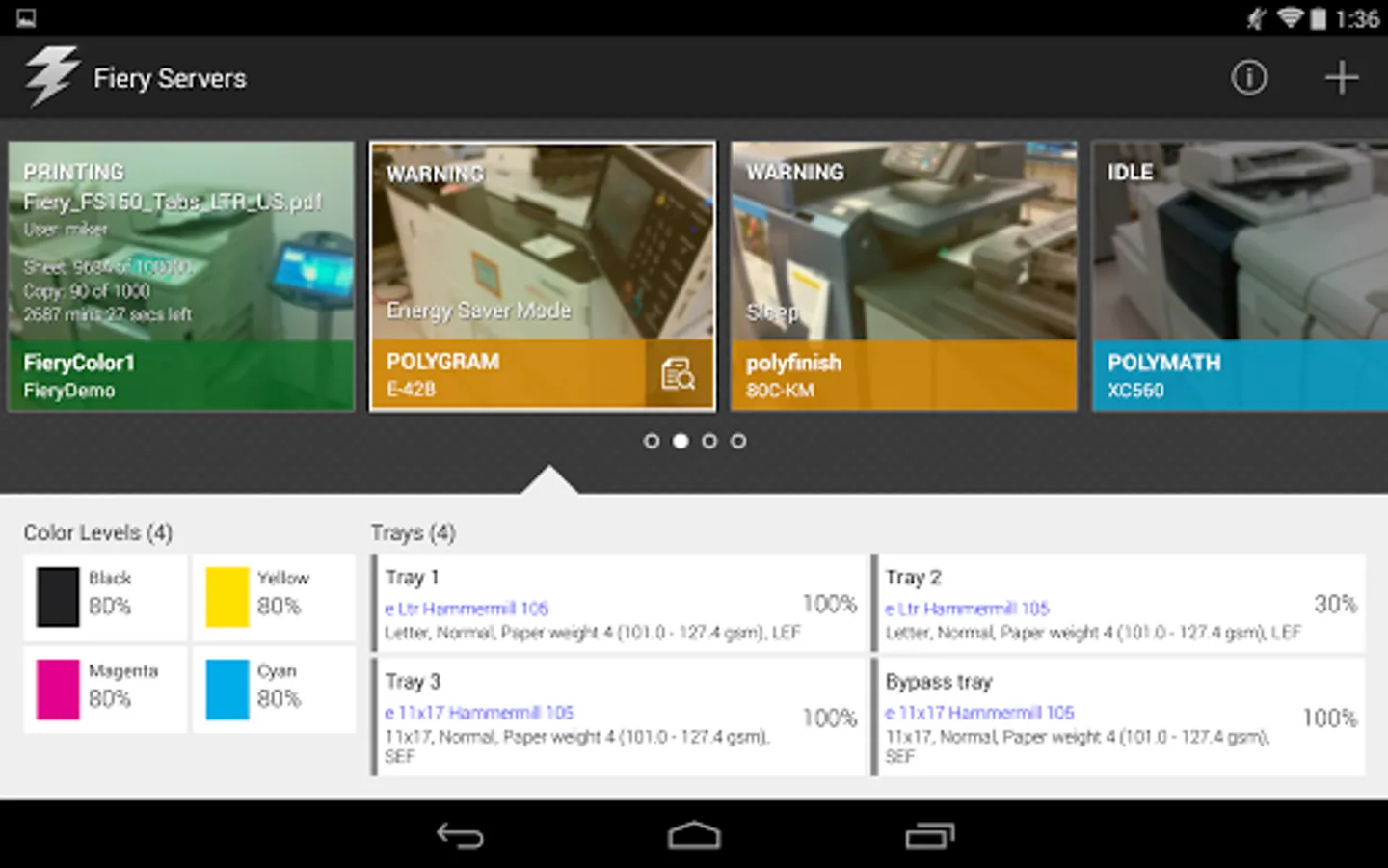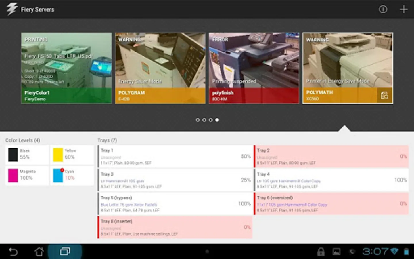 Fiery Go allows you to monitor the status of multiple Fiery Driven™ printers and manage print jobs from anywhere. Using Fiery Go, you can import jobs and perform multiple job actions like printing, deleting, previewing*, and defining job attributes. The app alerts you about consumable status, errors in the print job, paper jams and more, so you can take immediate action. Easy to learn and use, Fiery Go gives you more flexibility and allows you to multi-task for a more efficient workplace and higher productivity.