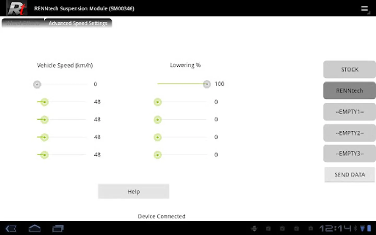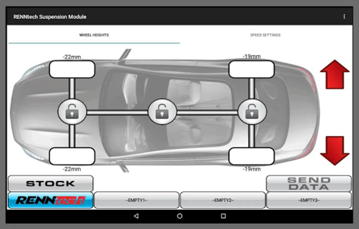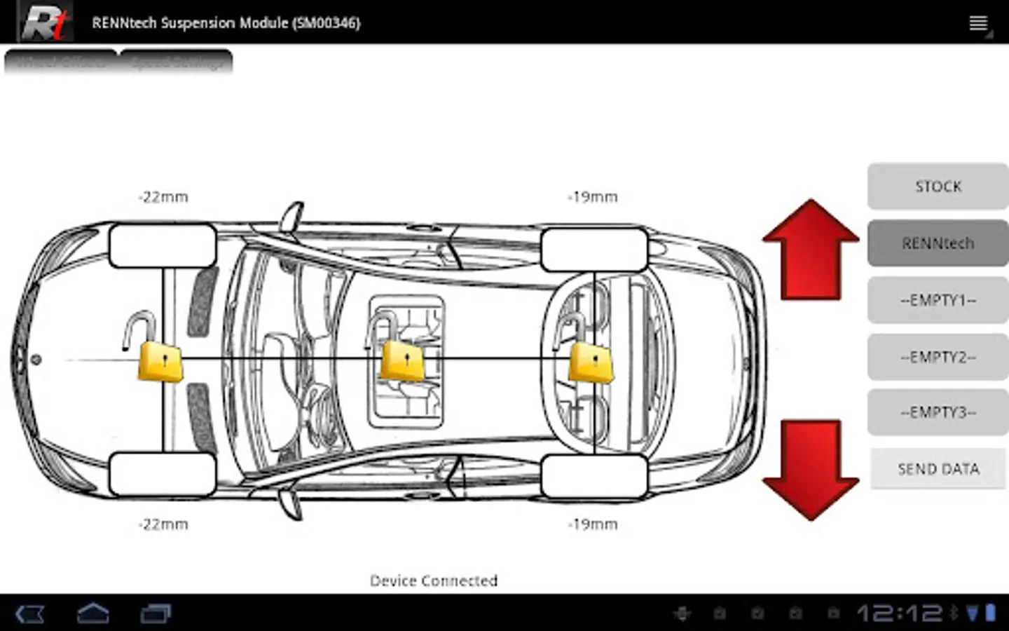 An application used to control the RENNtech V3 Digital Lowering Module (DLM) or the RENNtech Hand-held Suspension Module (HSM). This application will allow you to change the ride-height of your RENNtech DLM-equipped vehicle on-the-fly. Save and quickly load your three favorite ride settings for a special look or to get up that pesky sloped driveway. Application requires a USB host connection to the RENNtech DLM or HSM.