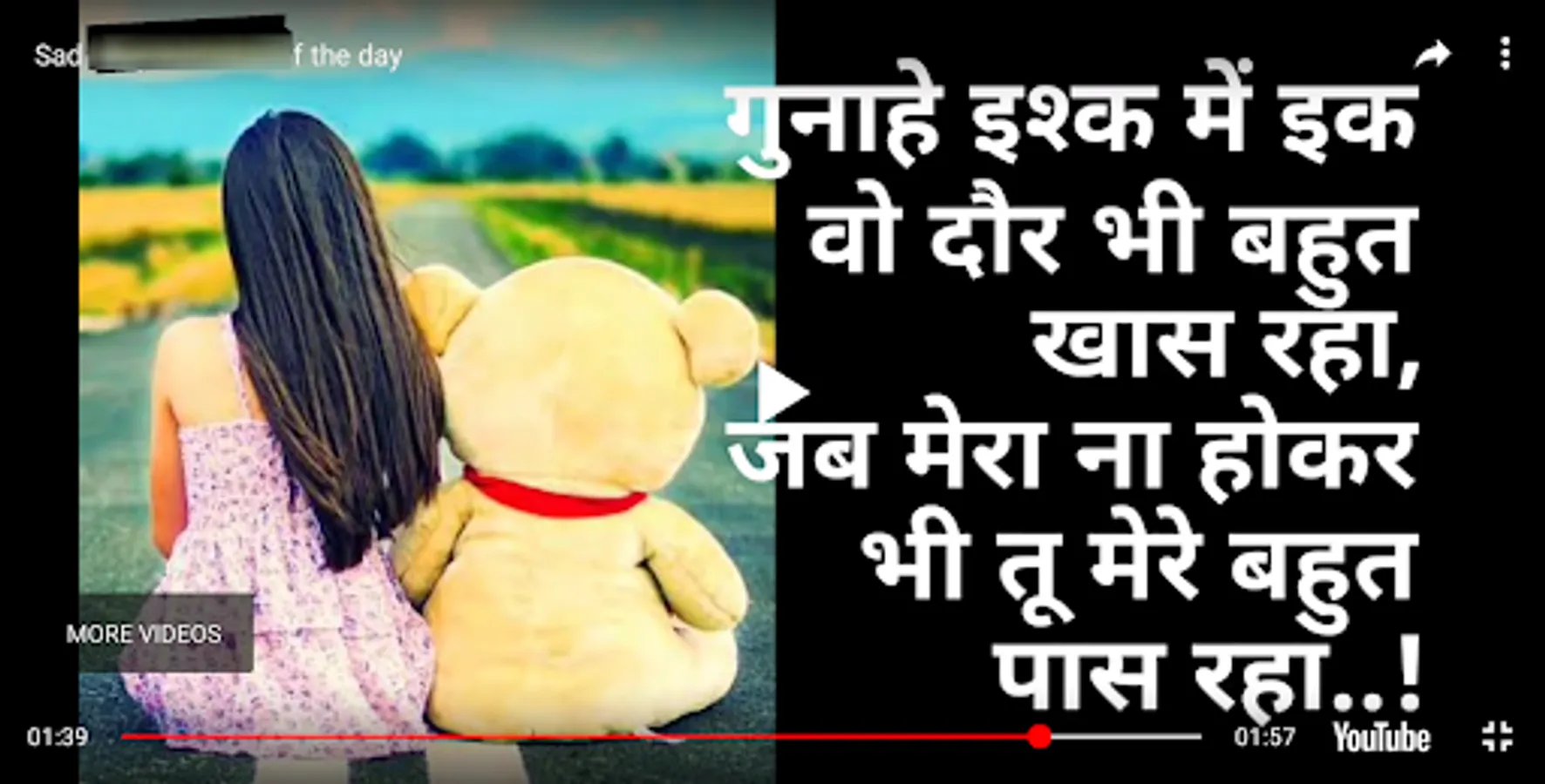 Discover sad Urdu poetry and love videos on YouTube. We have carefully selected sad status between the most popular sad Hindi shayari YouTubers and influencers. We also have love video status for WhatsApp in several languages like Spanish, English, Urdu, Telugu, Tamil and Malayalam. Show your emotions & feelings with the best shayari for love 2022, including the attitude status for boys and girls love attitude.
