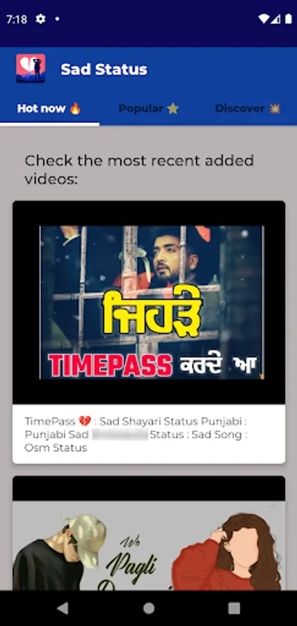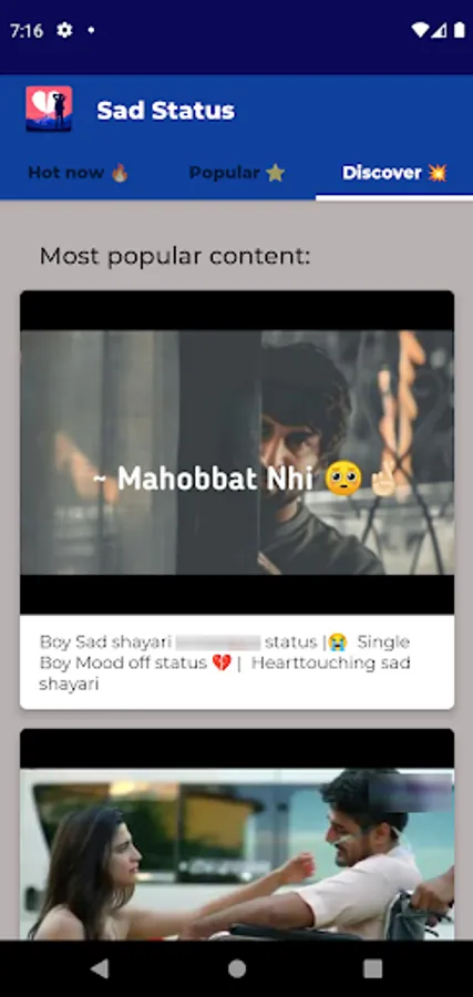 Explore a list with the best love video status for Instagram and sad Shayari for Whatsapp. We have selected the best sad love song attitude to share as romantic status in your favorite social network. This is the best shayari for love 2022 compilation! If you don't know how to express your feelings, you will find inspirational quotes in our sad status of the day, and it's free! If you broke up recently, you can learn about girls love attitude and you can also use romantic poetry status to start a new relationship. On the other hand, you can fun have with Hindi comedy videos, they are really funny! Do you like Bollywood clips? Romantic movies? This is your app!
