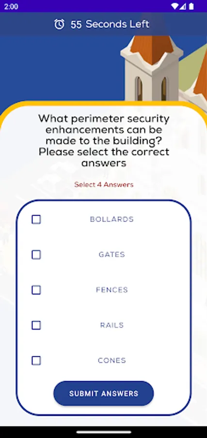 This SOAR SBD App is for leadership and volunteers involved with Places of worship to select different faith buildings and challenge their knowledge on SBD by completing the different scenarios which have multiple choice questions. As part of the app, there are opportunities after each scenario for users to upload best practices they have in their buildings as well as have access to documentation and further reading on different elements of security.