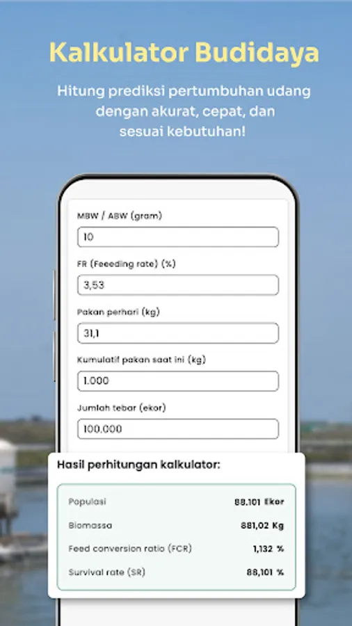 Cultivation Calculator: Monitoring shrimp growth is easier without the hassle of calculating the sampling formula manually.