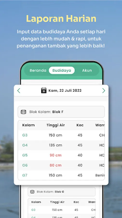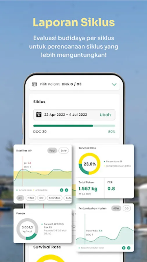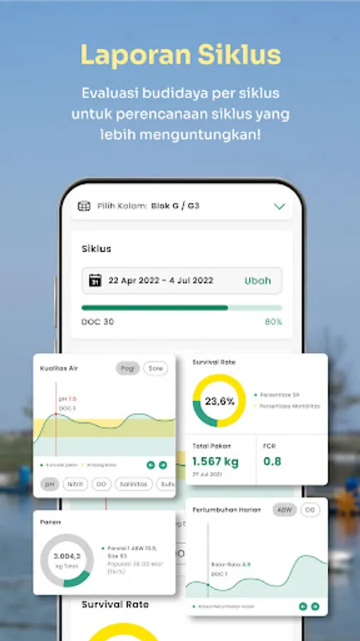 Cycle reports: Accurately monitor daily FCR, survival rate, water PH, development and shrimp farm performance through digital logs or journals right from your phone.