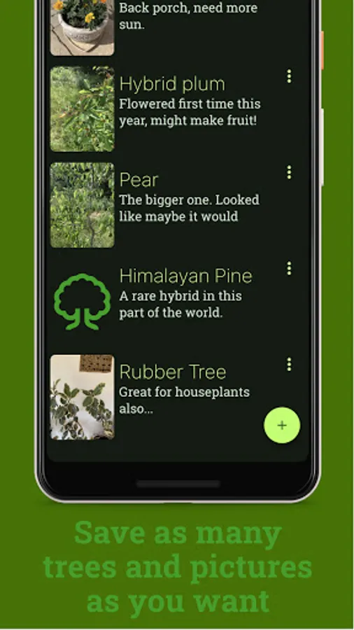 Every tree starts with a placeholder image, but you can -- and should (!) -- add as many images as you want by tapping the Add Picture icon. The most recent picture is always chosen as the tree's avatar. The date of every pic is recorded, and they can be viewed in a scrolling timeline (swipe up to delete a pic you no longer want). Tapping on a pic in the timeline lets you view it in full detail (in a format good for screenshots). Give the pic a long press to share it in whatever ways your device supports, such as email or text message.