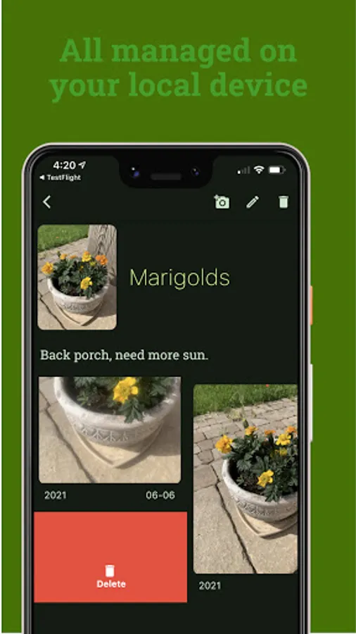 TreesTracker lets you name each of your plants and capture an unlimited number of images over time. It's ideal for long-term tracking of plants or trees over a single growing season .... or over many years.