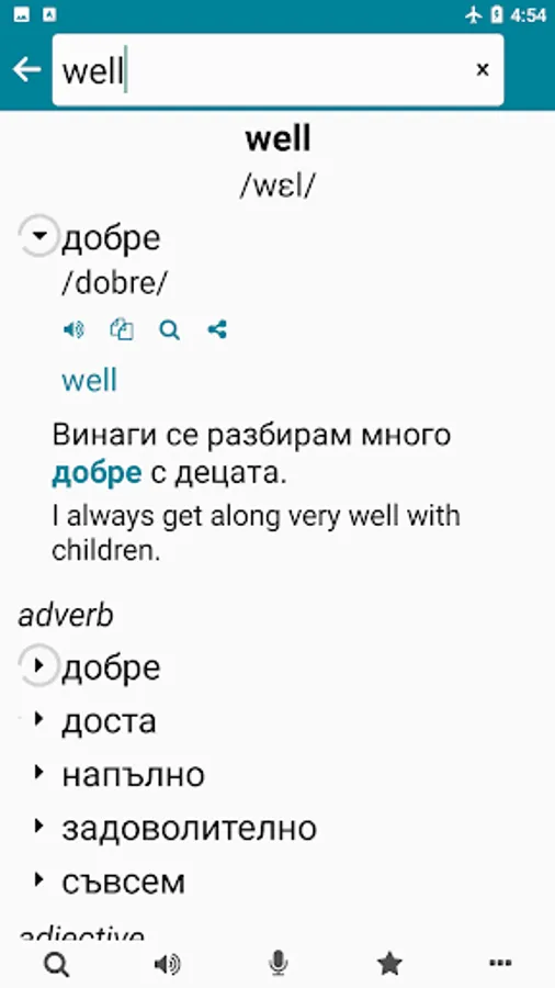 A quick Bulgarian English offline dictionary, alternative translation, irregular verbs, frequently used Bulgarian sentences, tests (writing, listening, speaking) and games...