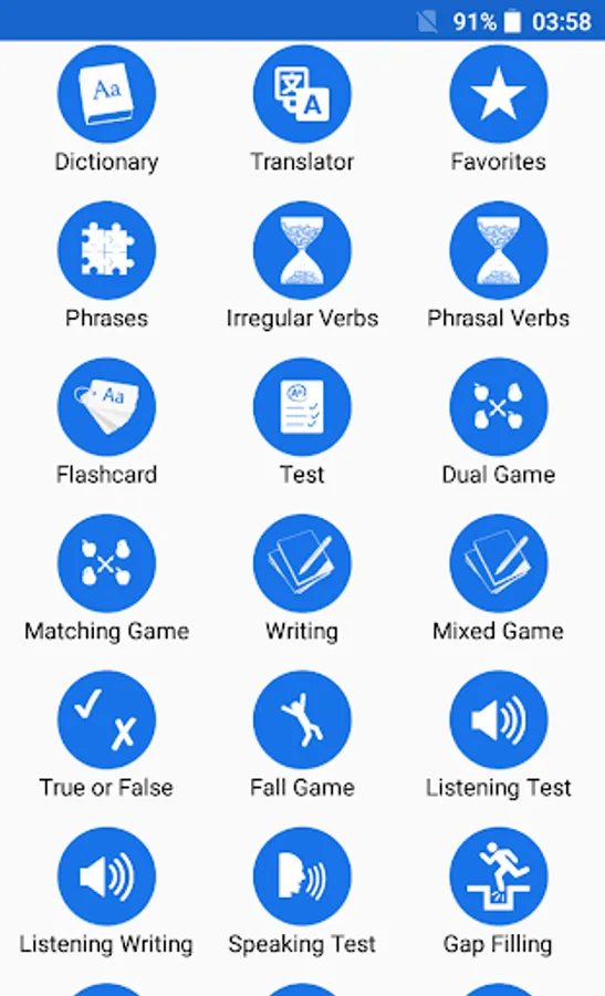 A quick French English offline dictionary, alternative translation, irregular verbs, frequently used French sentences, tests (writing, listening, speaking) and games...