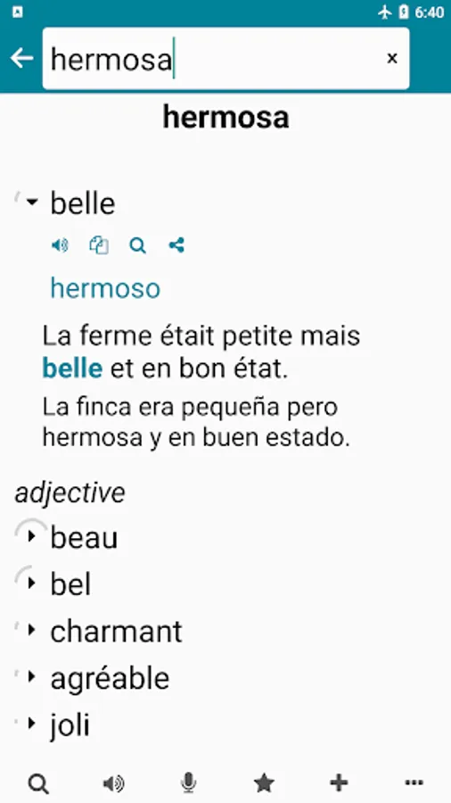 A quick French Spanish offline dictionary, alternative translation, frequently used French / Spanish sentences, tests (writing, listening, speaking) and games...