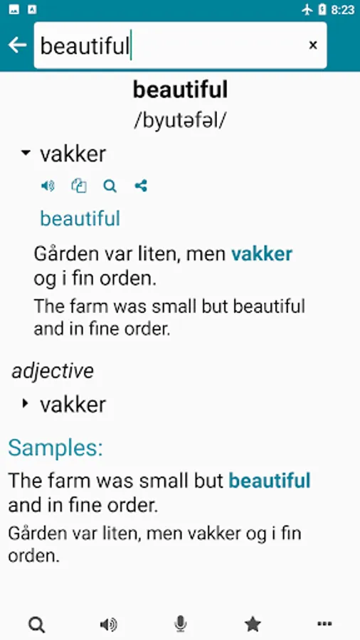 Norwegian to English 67,000 words and phrases.You can access hundreds of thousands of words and sentences (Norwegian translations) in the database very quickly.