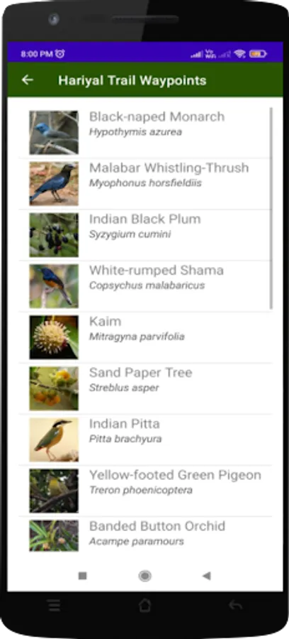 The idea is to engage Karnala Bird Sanctuary visitors using technology and assist them in exploring the wilderness on their own. This app is also a tool for environmental educators, especially teachers who sometimes do not have access to natural history resources or persons. The app brings nature trail education to its users' fingertips, thus doing away with the need for an expert or field guide in the first place. Nevertheless, it is not a substitute for nature guide. The app will help stimulate the visitor's interest. For more advanced information, they could sign up for programmes with the Nature Information Centre (NIC) of Karnala Bird Sanctuary. In case you wish to add your findings from a particular trail, you could do the same on www.inaturalist.org