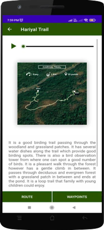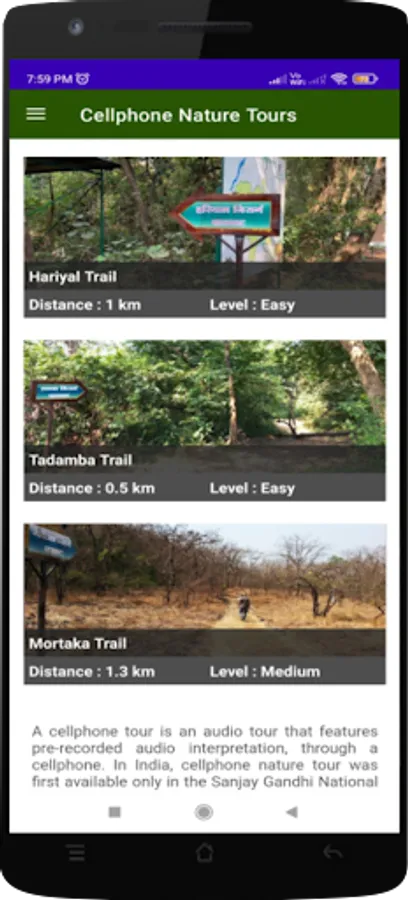 Each trail covers 20 points of interest found along the designated nature trail, including interesting trees and birds. In the case of birds, we have suggested points where the bird is likely to be spotted. So do not get disappointed if you don't see the bird. The app describes 60 species (30 trees and 30 species of birds) along with their pictures and detailed taxonomical and ecological information. The content is provided in text form as well as in audio format. The text form includes complete information, while only highlights are included in the audio commentary. The language has been kept non-technical. The app's highlight is its text and audio commentary, which gives a live experience. The trails are GPS mapped and points of interest geotagged, which will help navigate the trail easily. Each point of interest is marked on the trail and the site. They are assigned a number and QR code. In the presence of an internet connection, one can scan the code and listen to the commentary or else they could refer to the point number and read or play the information.